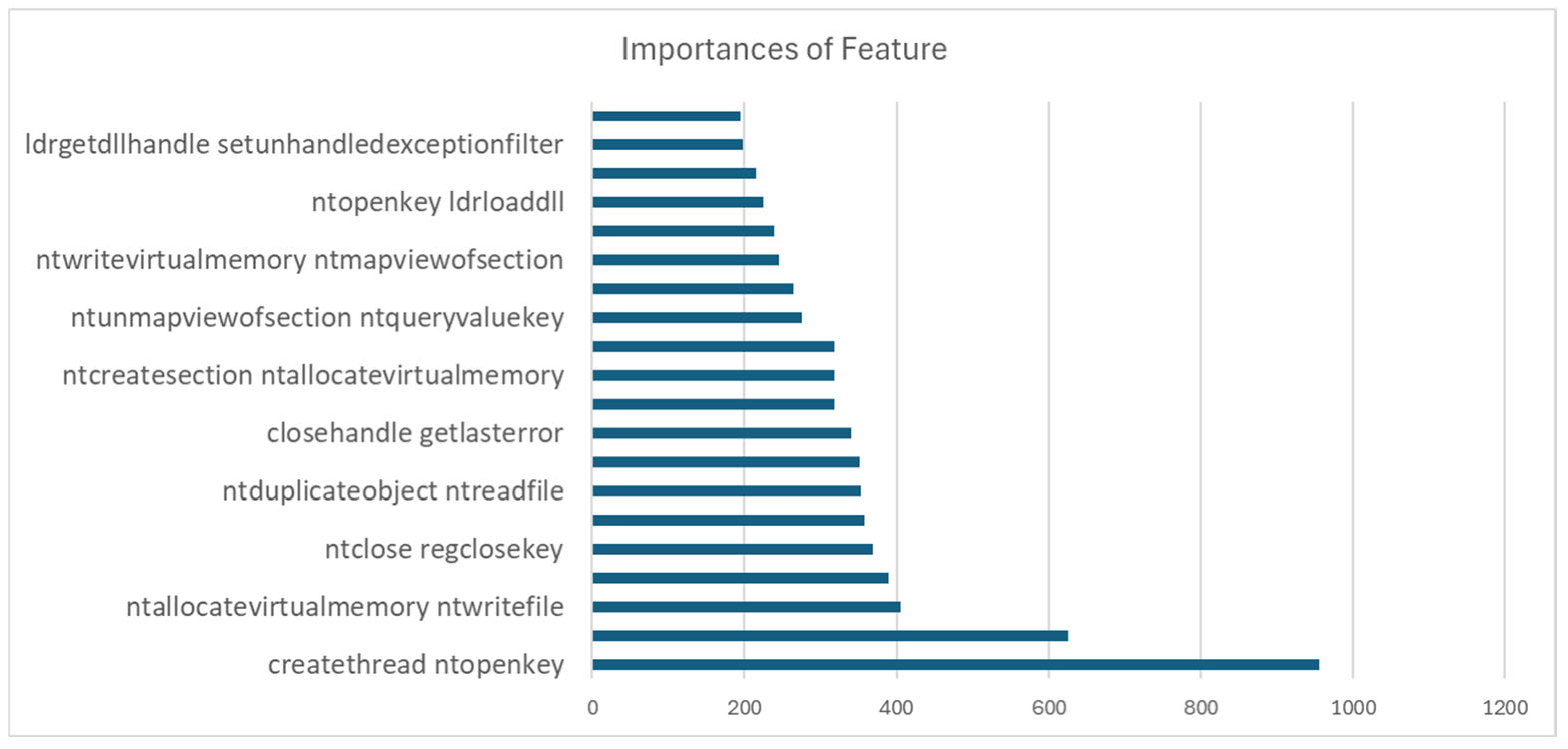 The benchmark dataset contains a total of 30,970 variables, including API, REG, DIR, STR, and others, among which 232 variables correspond to APIs. In addition, from our custom dataset, a total of 1236 API calls were extracted for analysis.