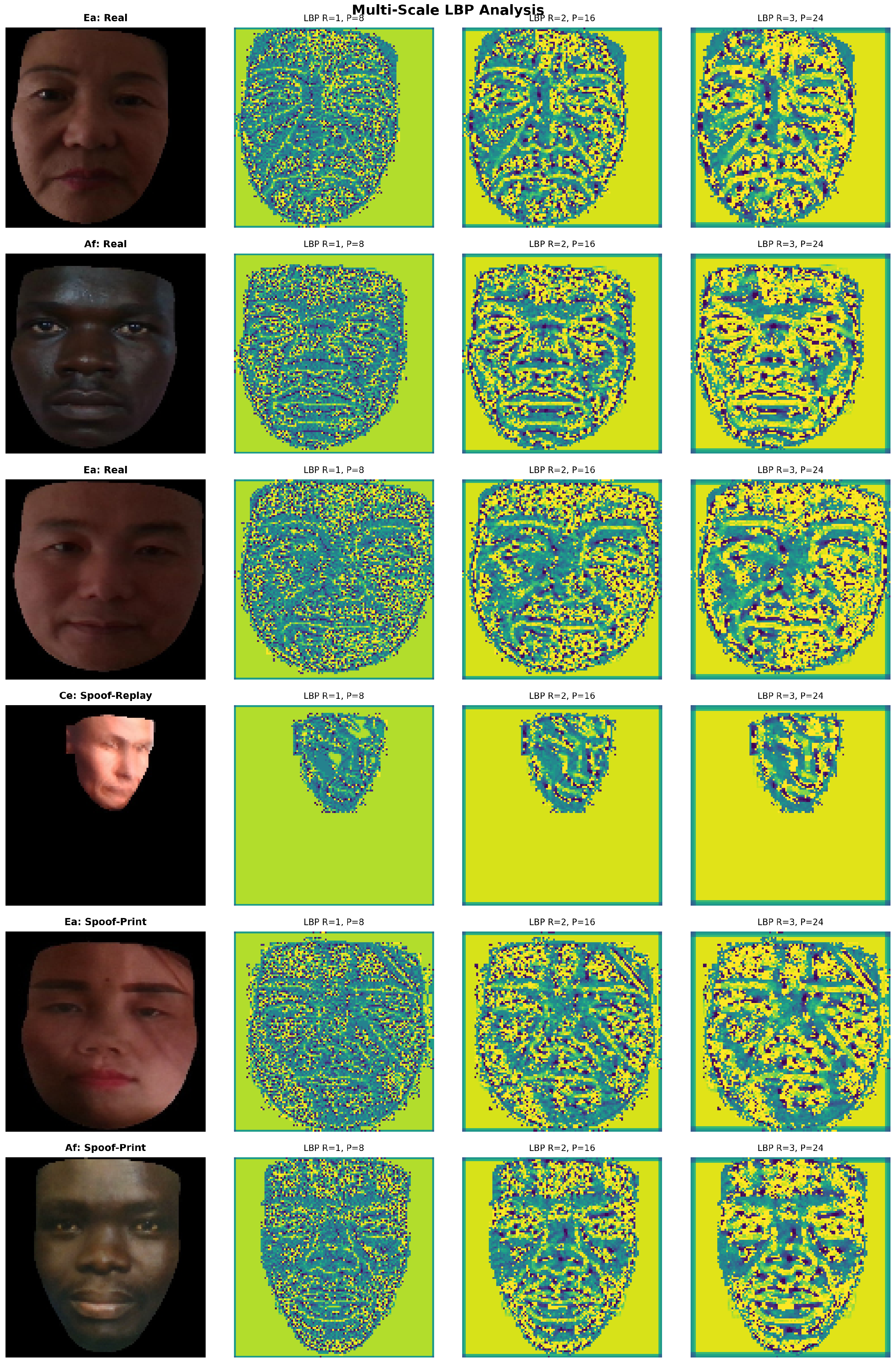 Figure 2 demonstrates how these multi-scale patterns capture different levels of facial texture detail across ethnic groups and attack types. This multi-scale approach captures texture patterns at different spatial resolutions, effectively identifying printing artifacts and micro-texture variations characteristic of presentation attacks across various scales.
