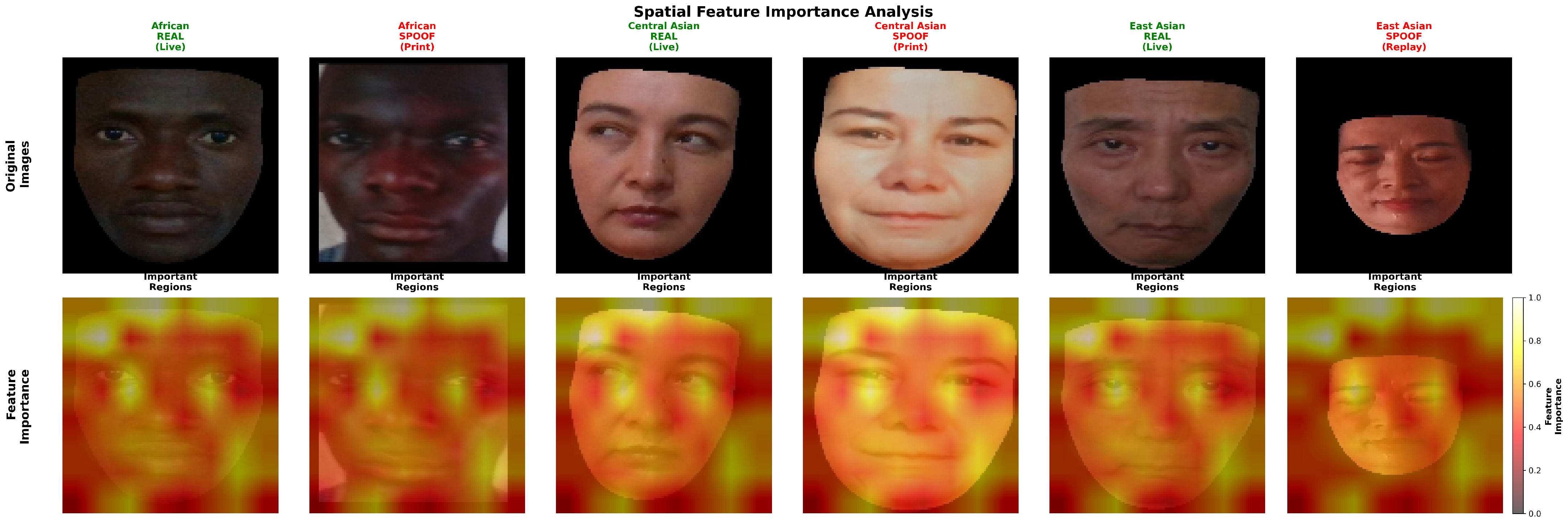 Figure 4 illustrates the spatial distribution of discriminative features across facial regions, revealing which areas contribute most significantly to presentation attack detection decisions for different ethnic groups and attack types.