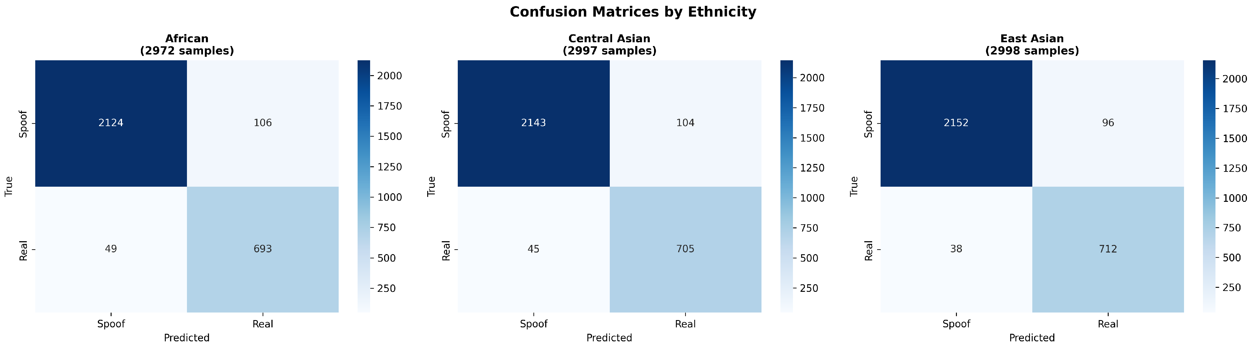 Figure 8 provides complementary evidence of fairness through t-SNE visualization of the learned feature space, demonstrating that the 3456-dimensional LBP representations cluster by attack type rather than ethnicity, confirming unbiased feature extraction across demographic groups.