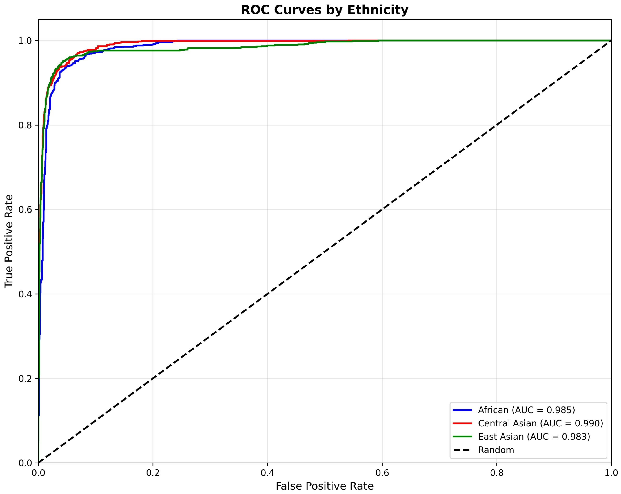 Figure 6 presents the ROC curves for African, Central Asian, and East Asian subjects, illustrating consistently high discriminative capability across all ethnicities.