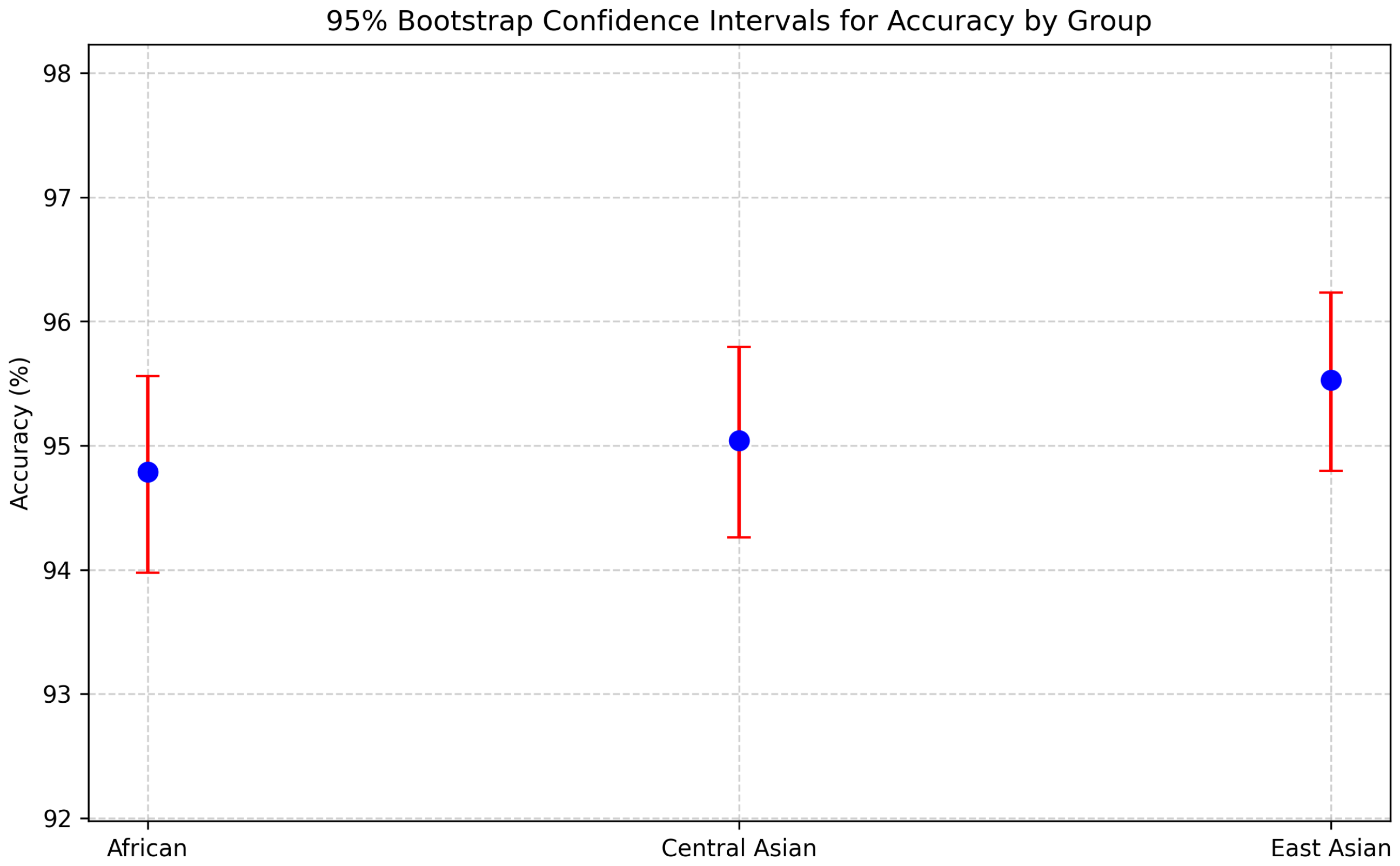 Additionally, bootstrap-based 95% confidence intervals validate the accuracy distributions across ethnic groups.