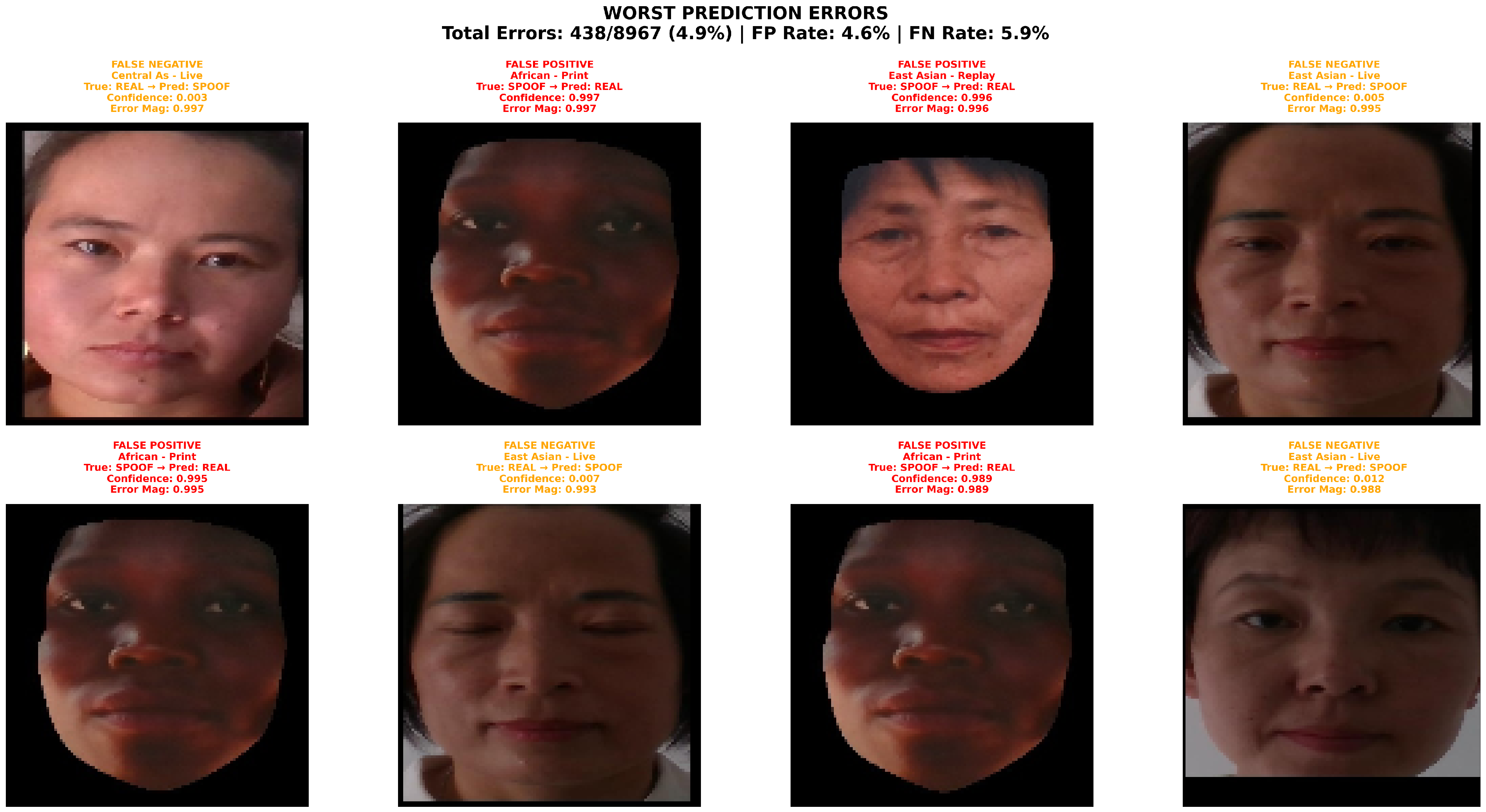 Figure 10 presents representative misclassified samples with corresponding confidence scores and error magnitudes, revealing common challenging scenarios such as low-light conditions, extreme head poses, and high-quality print attacks that evade texture-based detection.