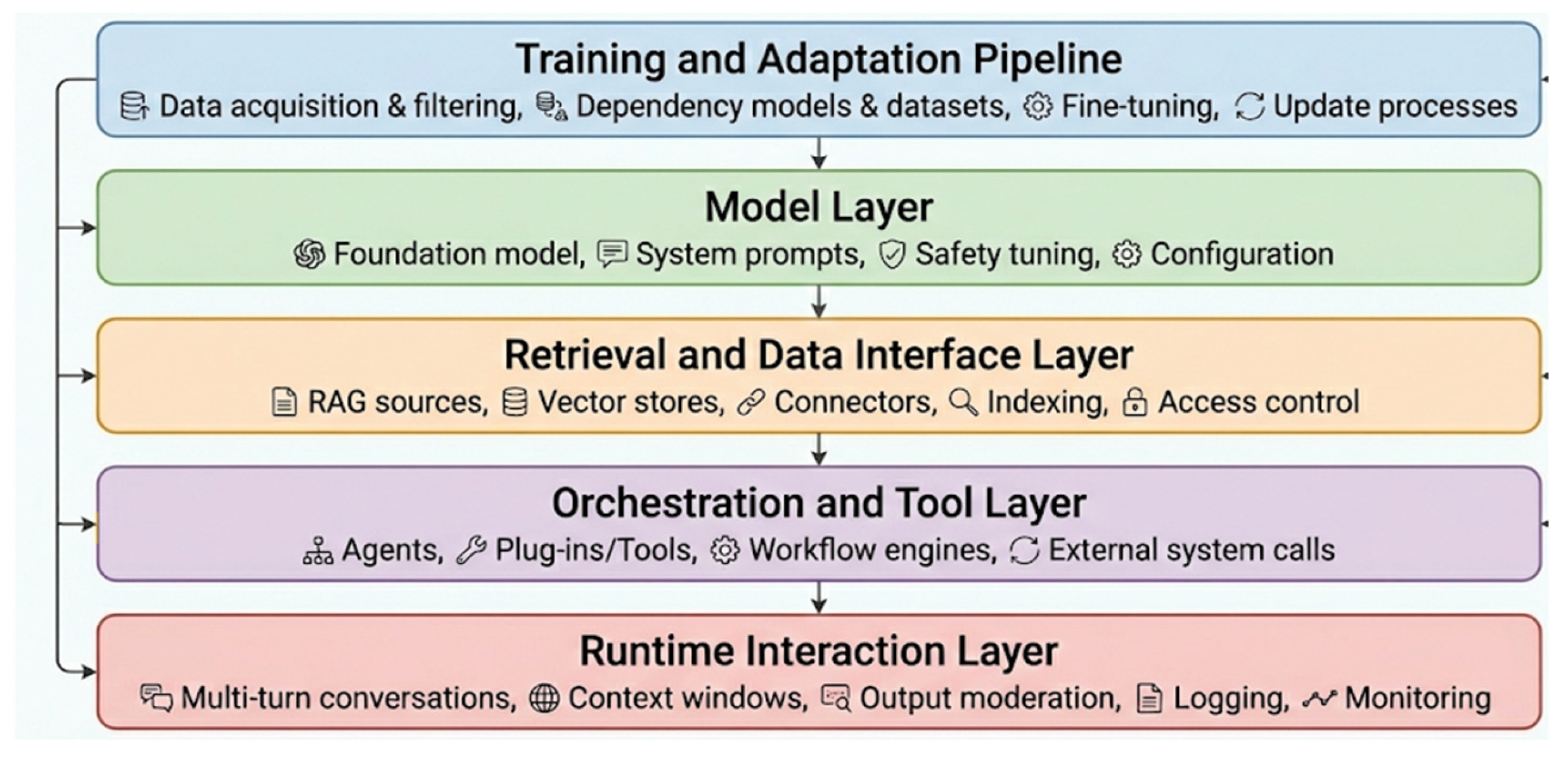 - Training and adaptation pipeline (data acquisition and filtering, dependency models and datasets, fine-tuning, and update processes). This layer determines the system’s baseline behavior and latent risk. Errors or compromises here propagate downward and are difficult to fully correct later, echoing long-standing lessons from software supply-chain security.