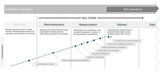 Intelligence operations are depicted as preceding traditional SOC activities, enabling the identification of contextual IOT before reconnaissance. The diagram illustrates how preparatory phases, such as the emergence of phishing kits or domain registrations, can be systematically monitored to expand the defender’s intervention window prior to delivery or exploitation.