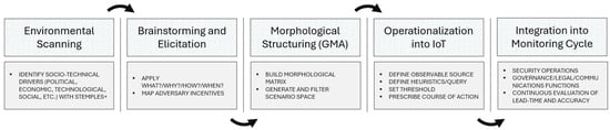 The proposed methodology follows a structured workflow designed to transform contextual drivers into actionable early-warning indicators. The process begins with environmental scanning, in which socio-technical factors are identified using the STEMPLES+ framework. These drivers are then subjected to structured brainstorming sessions to elicit potential attacker incentives and to map events through the What–Why–How–When lens. In the third stage, the drivers and incentives are formalized into a morphological matrix, where GMA is applied to generate the whole space of possible attack scenarios and filter out inconsistent combinations. The fourth stage translates these consistent scenarios into IOTs, each defined by an observable source, a heuristic, a threshold, and a course of action. Finally, the IOT is embedded within the operational monitoring cycle, serving as input for security operations, intelligence teams, and governance functions. This workflow in Figure 2 ensures that abstract foresight analysis is systematically linked to practical, auditable organizational defense mechanisms.