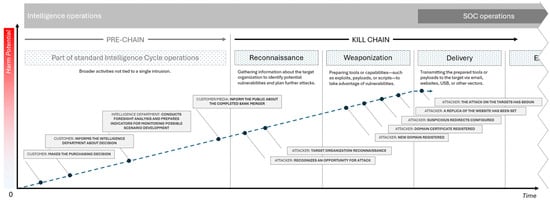 To illustrate the positioning of this pre-chain methodology within cyber-defense operations, Figure 1 depicts how intelligence operations were conceptualized as preceding and complementing traditional SOC operations, thereby expanding the intervention window prior to delivery or exploitation.