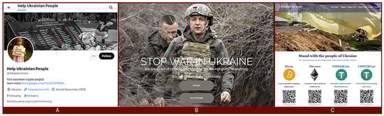 Figure 5. (A)—Social media profile promoting the suspicious domain helpukraine.info shortly before the invasion of Ukraine [28]. (B)—Landing page of the fraudulent donation website supportukraine.today, registered on 22 February 2022 [29]. (C)—Landing page of the fraudulent donation website donate-ukraine.info, registered on 27 February 2022 [30].
