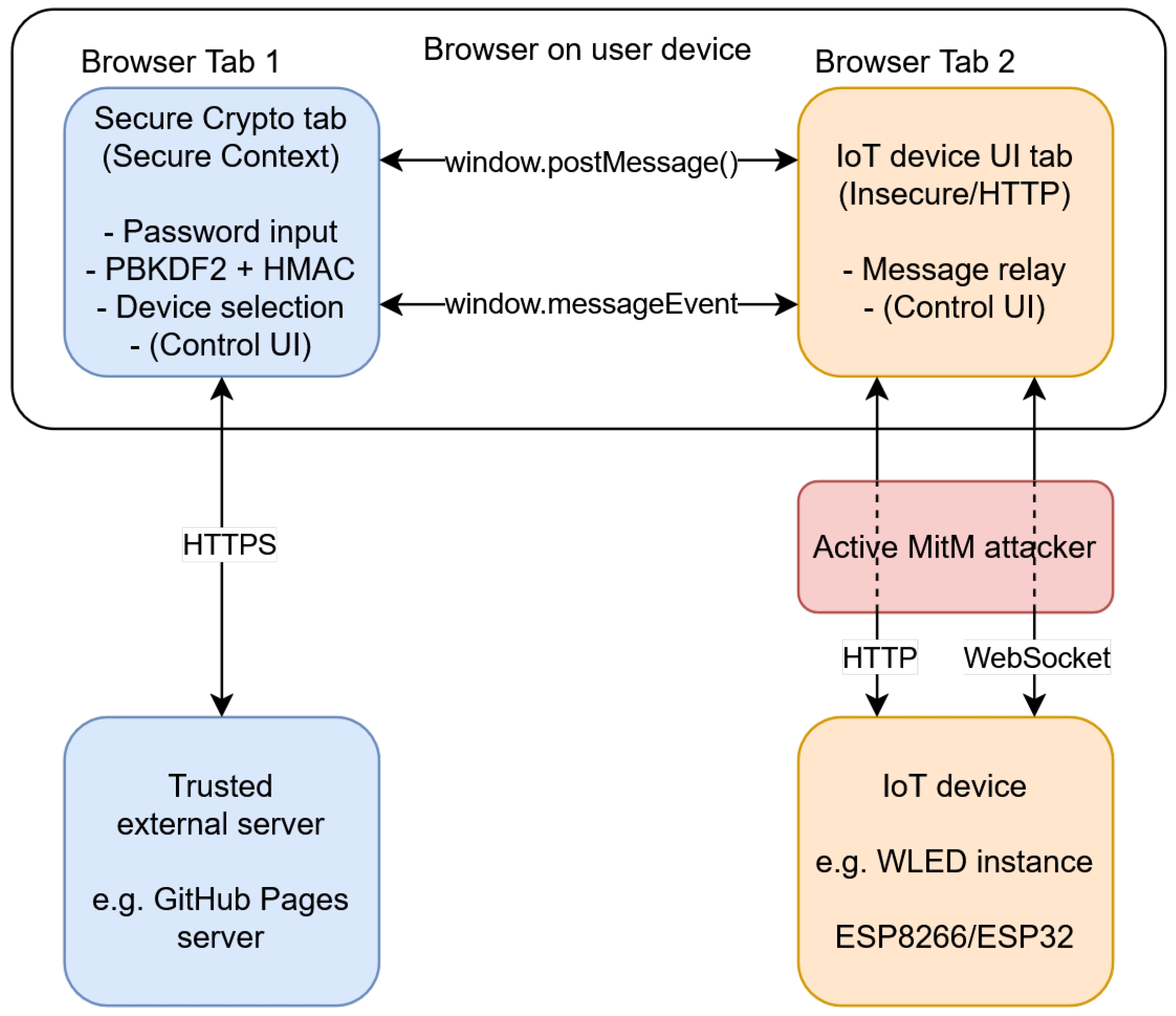 5], Section 1.3). As such, it is able to mount man-in-the-middle (MitM) attacks. By extension, the attacker has the same capabilities for the internal browser inter-window message channel. The attacker is unable to break cryptographic primitives and has no knowledge of the user’s password or the derived PSK; thus, it is unable to forge valid message authentication codes for a chosen plaintext. Furthermore, the attacker is assumed to be incapable of interfering with the TLS connection between the user and trusted external server in any way. While a denial-of-service attack would be possible, it is regarded as out-of-scope in this threat model. On the user side, the attacker has no direct control over code downloaded to or executed in the user browser, with the crucial exception of JavaScript downloaded directly from the IoT device. In particular, the attacker is assumed to be incapable of modifying the user’s browser, device hardware, or software, adding certificates to the user’s truststore, exploiting hardware access to the user device, or using social engineering to influence the user’s behavior. Similarly, on the device side, the attacker does not have hardware access to the IoT device; the attack surface is limited to the HTTP control network. The initial PSK agreement between the user and device occurs securely out-of-band.