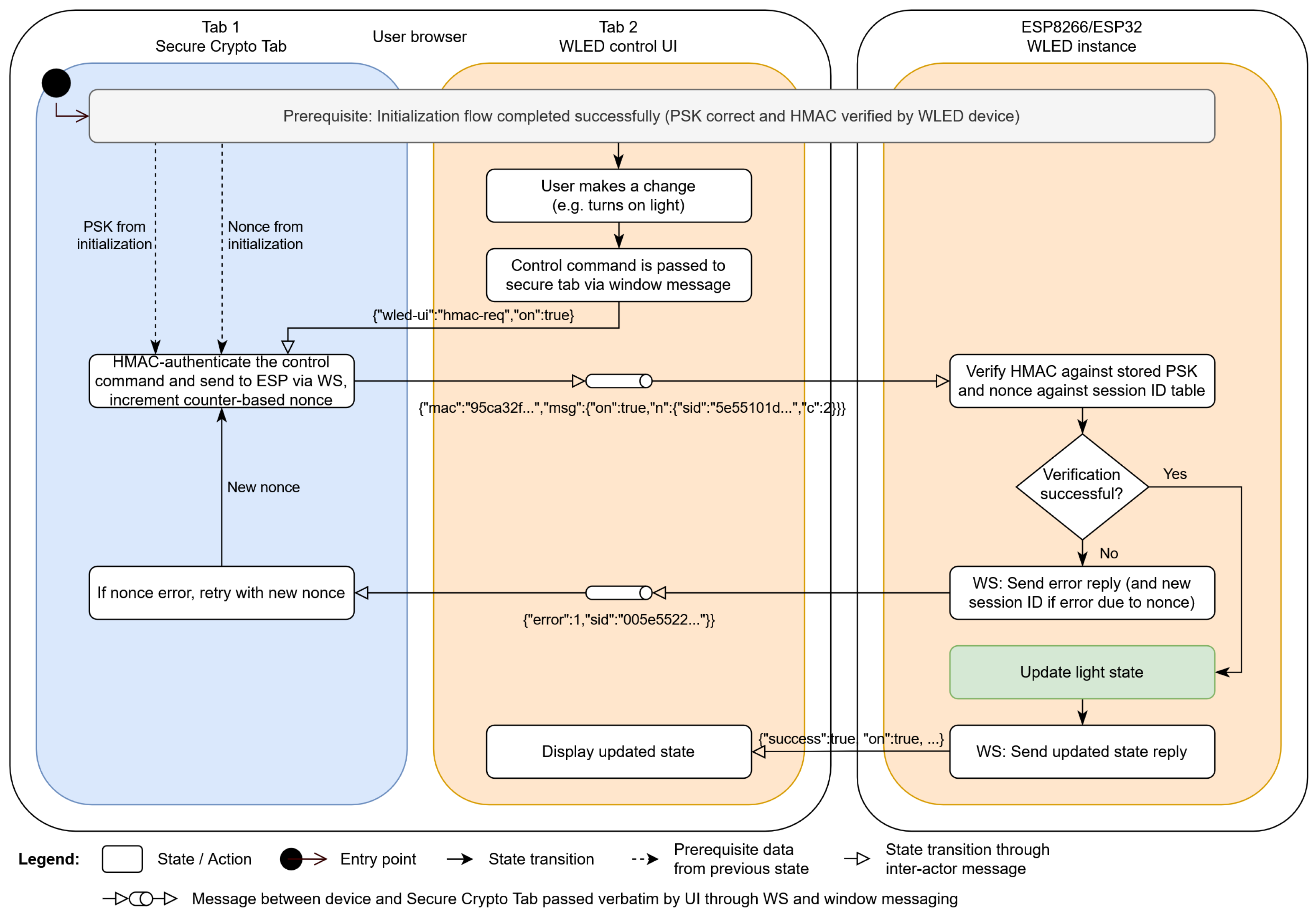 Figure 6 outlines the control commands authentication process. The “pipe” symbol in the UI tab denotes relay functionality; the UI tab does not process the message itself but just forwards it from the SCT to the ESP or vice versa, changing the message transport protocol from window messaging to WebSocket or back from WebSocket to window messaging, respectively.