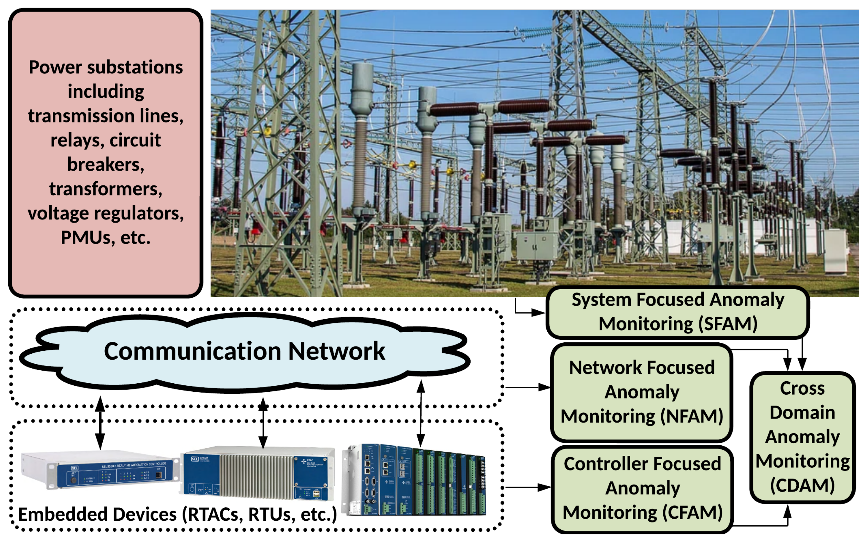17], such a comprehensive monitoring system should span controller-focused anomaly monitoring (CFAM) for validating behaviors of controllers and other devices in the grid, network-focused anomaly monitoring (NFAM) for validating network-level transactions and statistics, system-focused anomaly monitoring (SFAM) for validating temporal process dynamics, and cross-domain anomaly monitoring (CDAM) for validating the interplay between controller/system/network components (