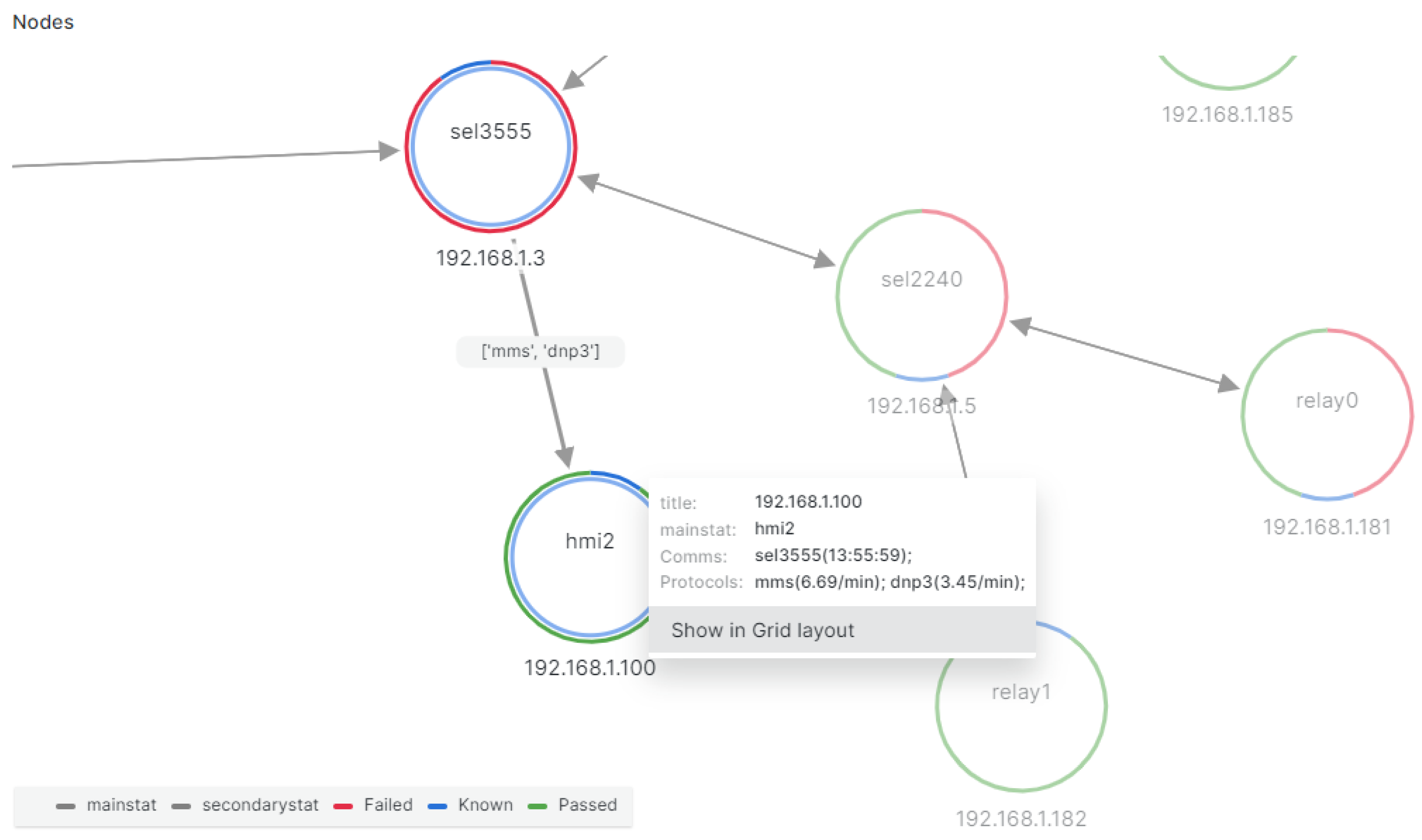 The user front-end of TRAPS is a dashboard GUI implemented using Grafana to visualize summaries of detected anomalies and overall semantically parsed observations with a hierarchical interactive interface providing an easy-to-use top-level summary as a broad overview and on-demand interactive mechanisms to access additional details when desired. The visualization dashboard shows various elements of situational awareness and anomaly detection, such as observed nodes and communications (along with salient communication properties such as request/response timing), tag values and tag histories, and detection of anomalies in expected match/pre-/post-conditions and the provenance of detected anomalies. Also, a graph of the network architecture with a color-coded visualization of detected anomalies is embedded in the GUI (sample screenshot in