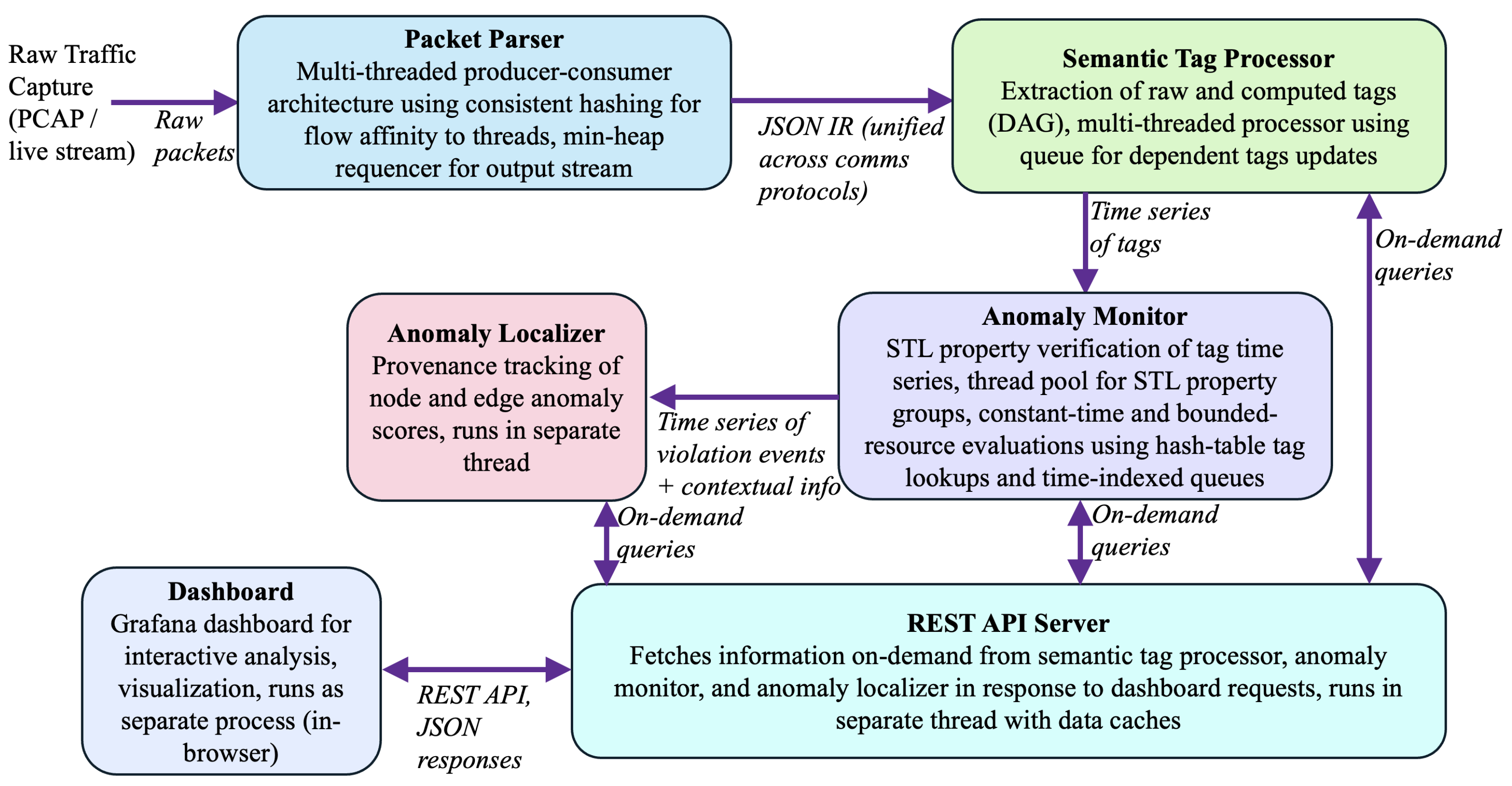 The JSON intermediate representation (IR) is protocol-agnostic, enabling the unified processing of heterogeneous protocols (DNP3, Modbus, IEC61850, C37.118, etc.) by the following stages of the TRAPS pipeline. The JSON IR stream is ingested by the semantic tag processor, which is based on a DAG computation model in which both the incoming JSON messages and the tags emitted during computation are processed through a pool of worker threads based on dependency queues to allow efficient recursive computation of dependent tags while maintaining time-consistent ordering. The semantic tag processor outputs a time series of tags, which are then ingested by the anomaly monitor component, which utilizes a thread pool to process groups of STL property verifications over the incoming tag time series. The anomaly monitor implements match/threshold conditions using constant-time hash-table lookups and temporal conditions (pre-/post-conditions) using time-indexed queues whose memory usage is bounded by the number of active STL conditions rather than operating time. The anomaly monitor outputs a time series of violation events with timestamps and contextual metadata (tags involved, violated property). This time series is then used by the anomaly localizer, which runs as a separate thread, to track provenance information (node and edge anomaly scores) for anomaly indicators by referring to the DAG structure to recursively identify the underlying raw tags that contributed to any flagged computed tag or condition violation. The REST API server runs as a separate thread to handle on-demand requests from the dashboard (Grafana-based in a browser) and/or third-party systems by fetching information as needed from the other components. The REST API server thread maintains local data caches to reduce queries to the other components.