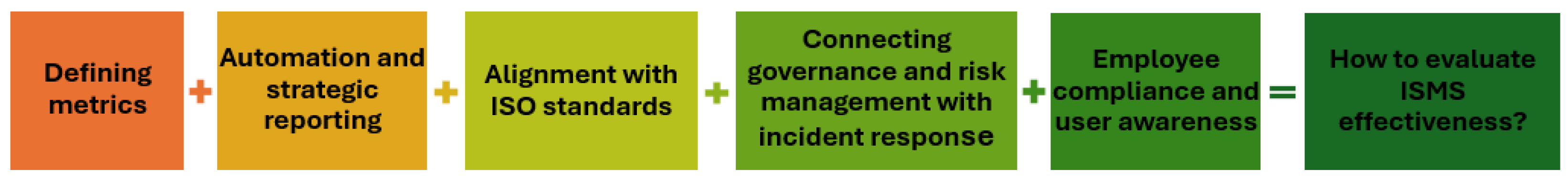 7] outline key ISMS tasks, internal audits, and risk reviews but do not define specific KPIs, instead they focus on establishing a framework for ISMS core processes and their criteria. For detailed effectiveness metrics, they recommend referring to ISO27004:2016. In a later study, Haufe et al. [