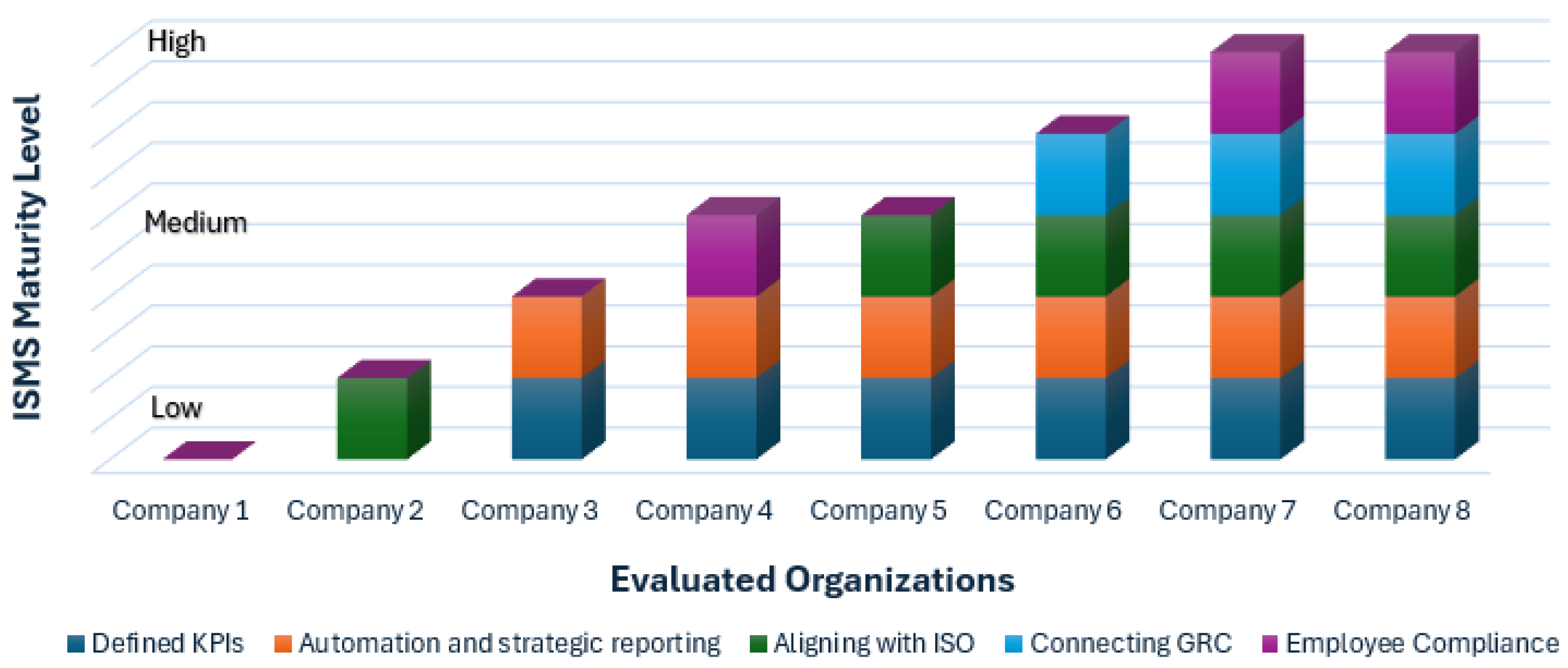 Figure 1), and the total height of the bar reflects the organization’s overall maturity and the robustness of its ISMS. Thus, the highest bars signify a strong foundation characterized by comprehensive, automated KPIs, while the lowest bars indicate a weak, reactive foundation relying on manual processes and audits. The data suggests that maturity is directly proportional to the quality and automation of KPIs rather than the simple volume of data collected.