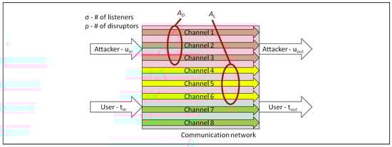 In our model, represents the number of wires (channels) between the transmitter and receiver available to the adversarial listener set, , and is the number of channels between the transmitter and receiver available to the adversarial disruptor set, 10. Communication is two-way between the transmitter and receiver and, following PSMT, the number of channels that must exist between transmitter and receiver is given by