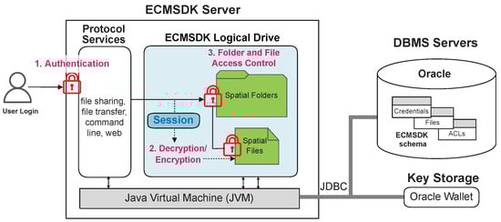 Our approach to protecting valuable spatial files in enterprise GIS environments comprises multiple components. Figure 1 shows the proposed storage security solution in the form of a spatial end-user interaction model in an enterprise GIS environment. Spatial users, using any protocol server, are first authenticated against their ECMSDK accounts. After a successful login, each file is decrypted. Access to spatial folders and files is controlled with the DBFS access control mechanism: that is, the ECMSDK Access Control Model (ACM). Upon user log out, files are encrypted for protection. User credentials can be protected in transit using SSL encryption, which can be integrated with ECMSDK [50].