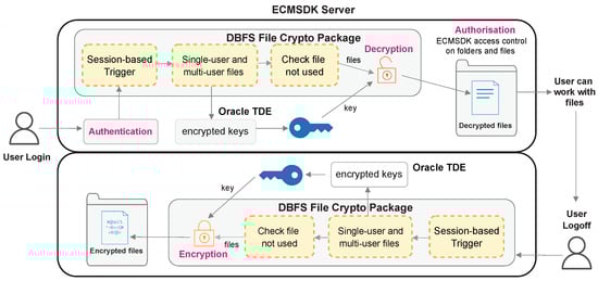 In our proposed solution, the original encrypted Large Objects (LOBs) containing the spatial files are never replaced with a decrypted version. During decryption, instead of replacing the original encrypted LOBs in the database’s permanent tablespace, the LOBs are decrypted and stored in the temporary tablespace. Oracle DBMS supports “temporary tablespaces that contain data that persists only for the duration of a user’s session” [71,72]. This permits temporary LOB datatype storage in such a way that data are not permanently stored in the database. Thus, we replace the LOB locator pointing to the original spatial file with the temporary locator that is stored in a separate ECMSDK table within the temporary tablespace. After decryption, users access, use, and update this copy of the LOB that contains the file content.