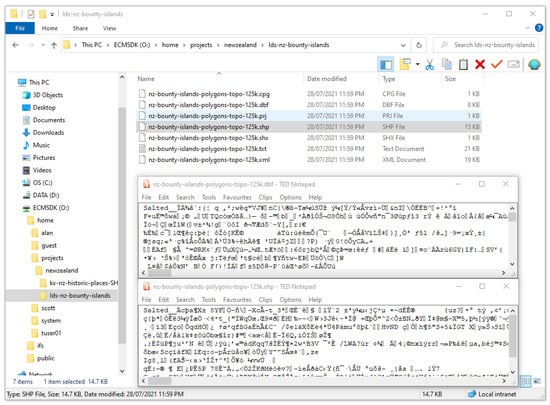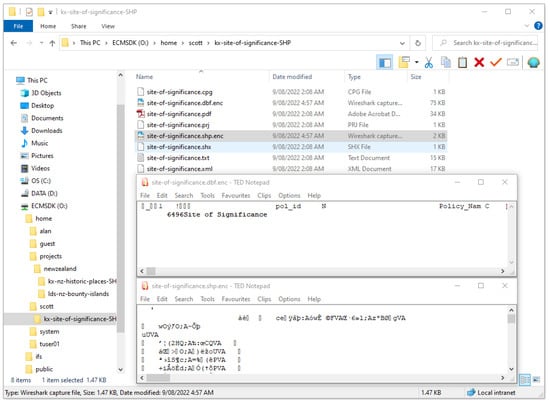 The specification of a single-user sensitive spatial file to be encrypted has been designed to be simple and can be performed using any GIS application or protocol service used to connect to ECMSDK shared folders, that is, from a desktop, web, or mobile device without the involvement of administrators. The proposed implementation system used here is to adopt the .enc file type. Use of this file type is compatible with existing file formats such as *.shp and *.json and does not add additional file overhead. The .enc file extension is added to the end of the filename, for example, “historical_places.shp.enc”, and the extension indicates the files are currently locked for protection and require decryption. For encryption of file-based geospatial layers, only files with valuable data would require this extension. For example, in the shapefile format, only .shp, .dbf, and .shx could have the .enc format appended. Figure 3 demonstrates a GIS user’s single-user files decrypted for use, with the full user interaction workflow are included in Supplementary Materials online, and this YouTube video https://www.youtube.com/watch?v=zMJV5zV0-zs (accessed on 18 April 2024).