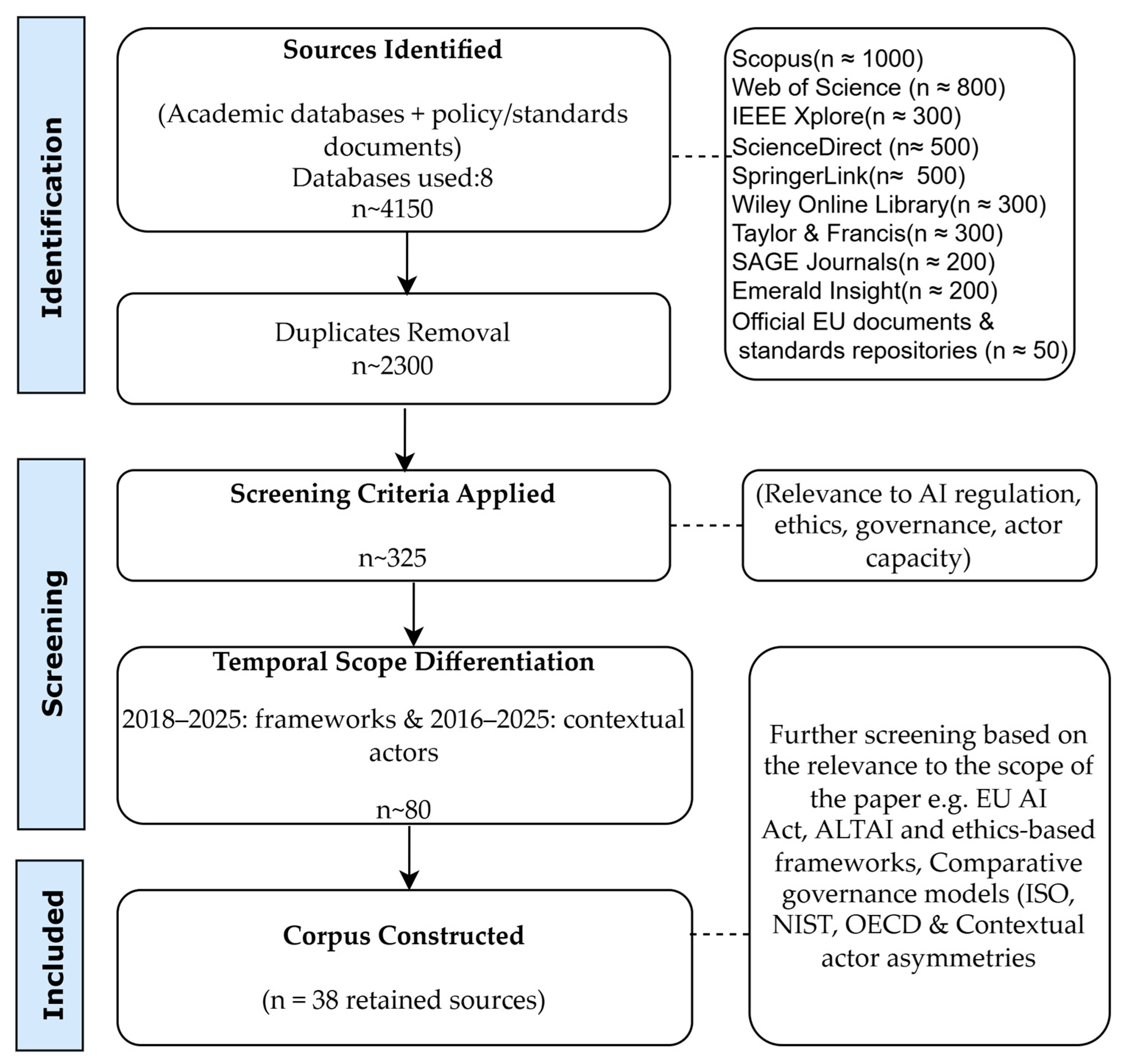 - For technical, legal, and governance-focused studies: be published between 2018 and 2025, reflecting the consolidation period of AI governance frameworks.