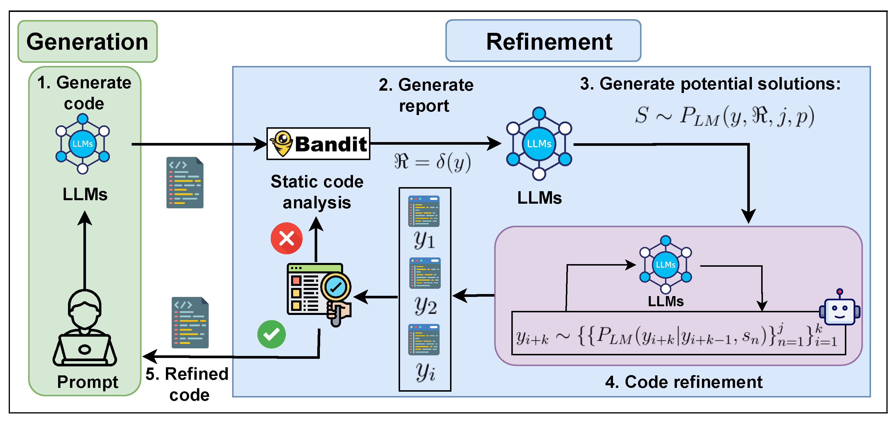- Iterative refinement: Each candidate solution is fed back into the LLM along with the vulnerable code to further refine and resolve any remaining vulnerabilities.