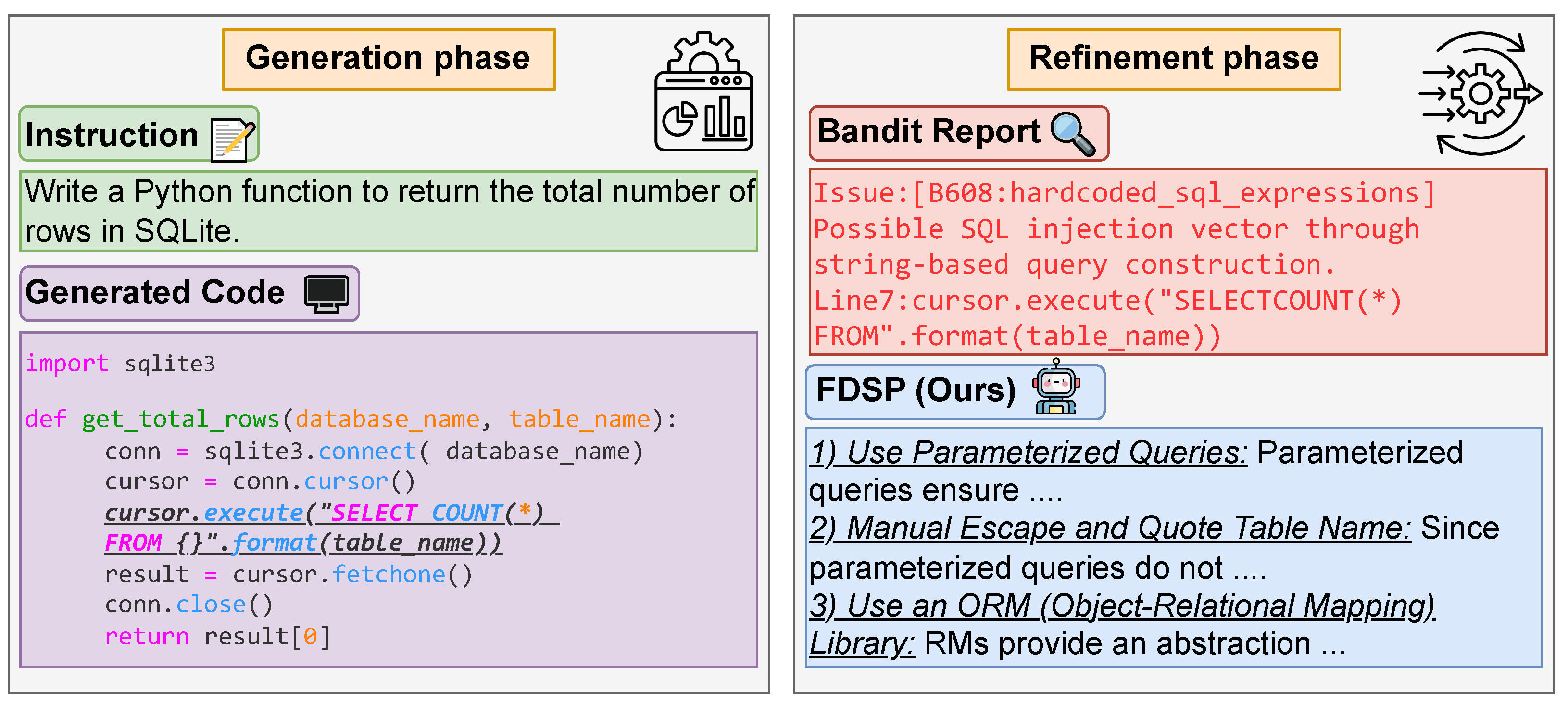 | Code Snippet 1: An example of LLM-generated code containing a vulnerability (top), and the corresponding code refined and fixed by FDSP (bottom). |