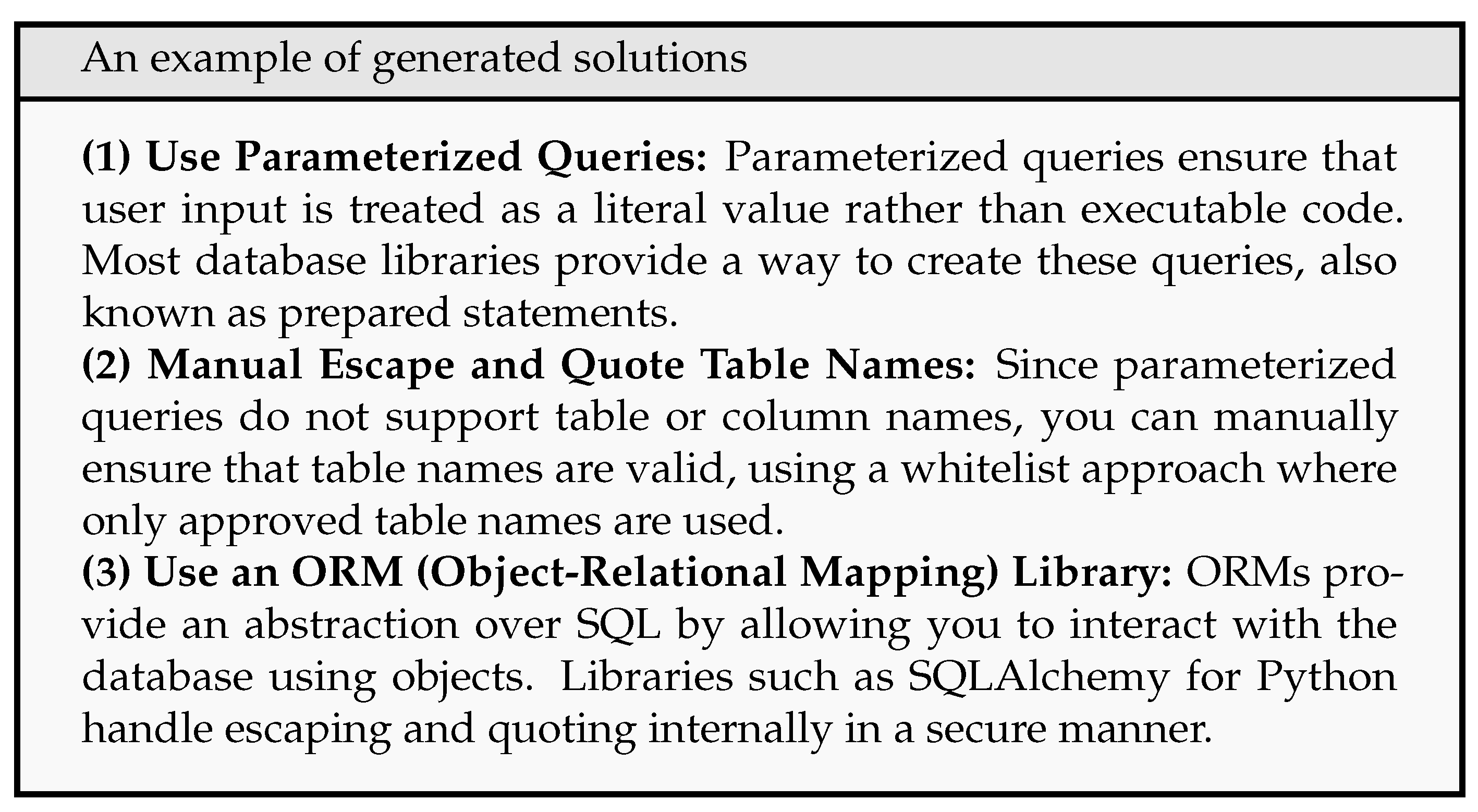 - Solution diversity: Different security vulnerabilities may require different fix strategies. Generating multiple solutions increases coverage of potential remediation approaches.