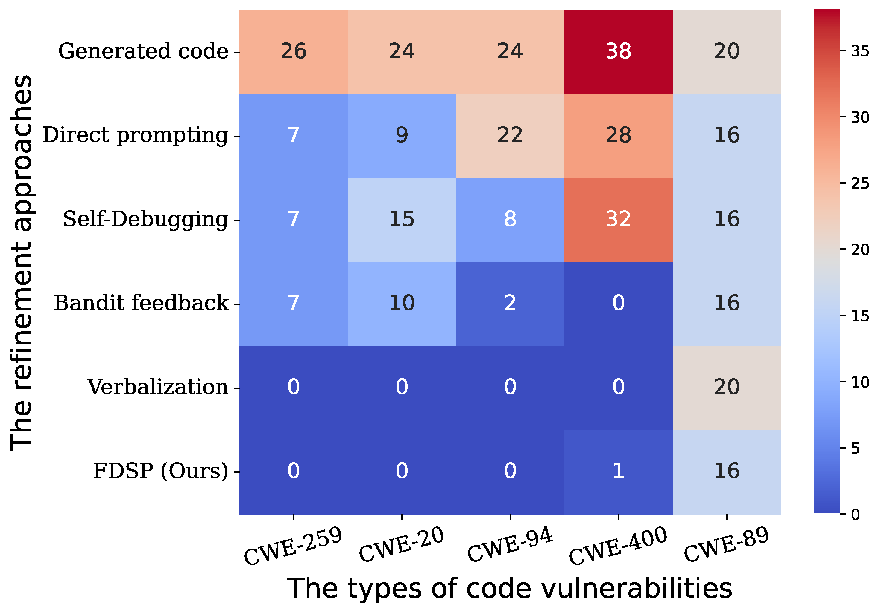 - How does FDSP improve LLM performance in refining code vulnerabilities?This question aims to assess how well the LLMs generate multiple potential solutions and iterate over each one to refine vulnerabilities.