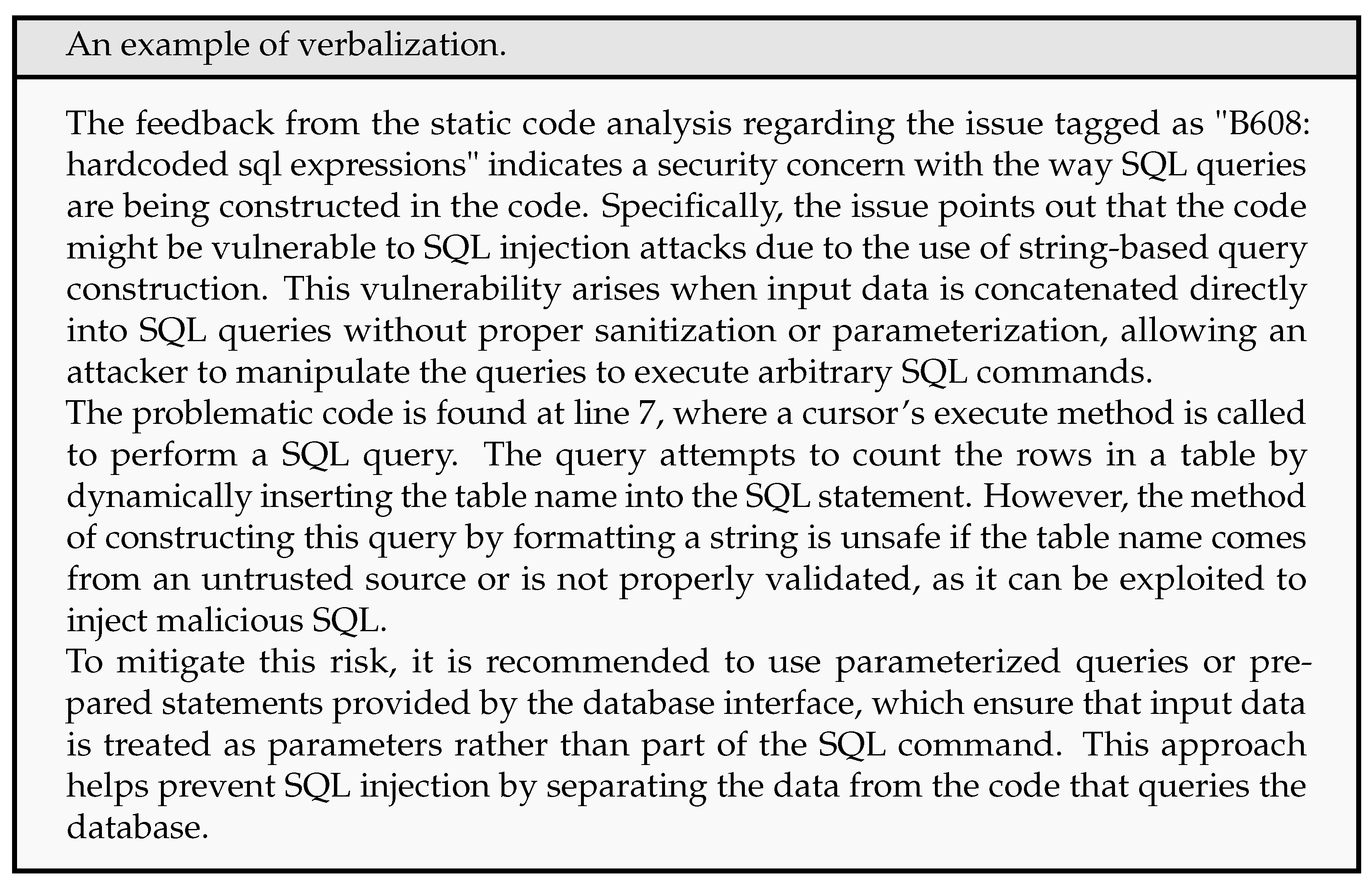 - Verbalization: We verbalize the feedback from Bandit, via an LLM, to produce intelligible and actionable feedback to resolve security issues. The verbalized feedback provides a detailed explanation in natural language of the specialized output from Bandit This expanded explanation offers deeper insights into the security issues and may suggest solutions to address the vulnerabilities.