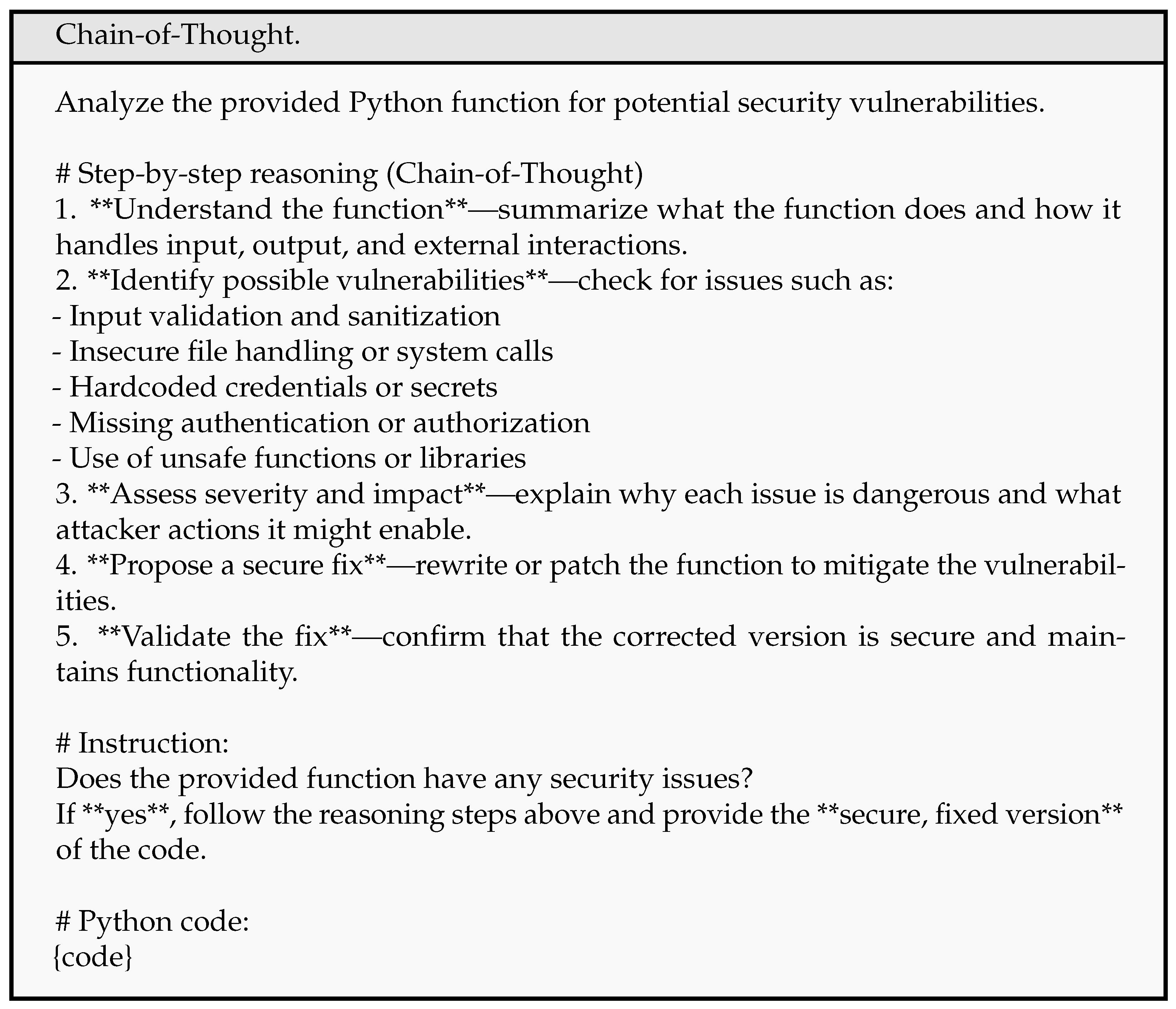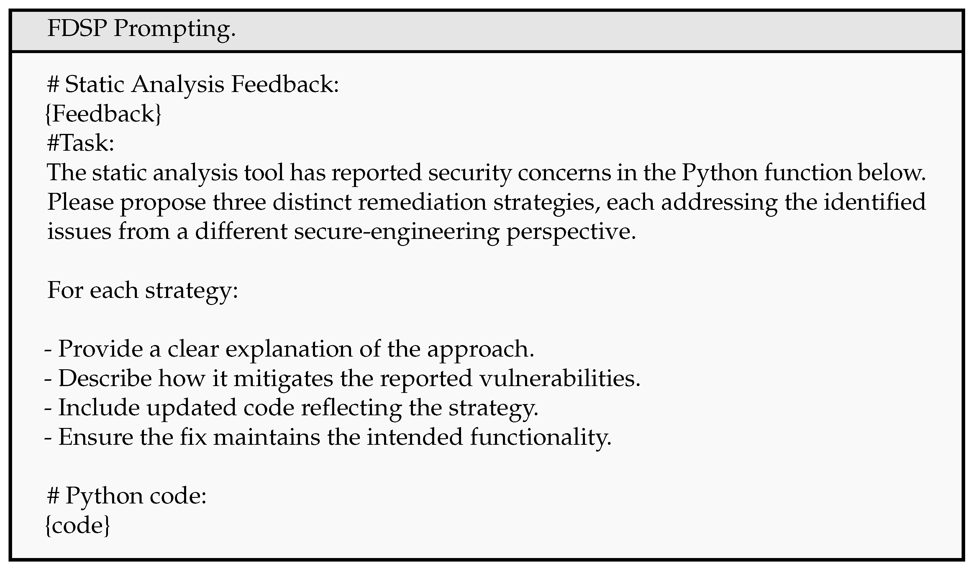 - Direct prompting: This approach involves sending generated code back to an LLM with the instruction: Does the provided function have a security issue? If yes, please refine the issue. If LLMs detect any security issues in the code, they will refine the issue and generate secure code.