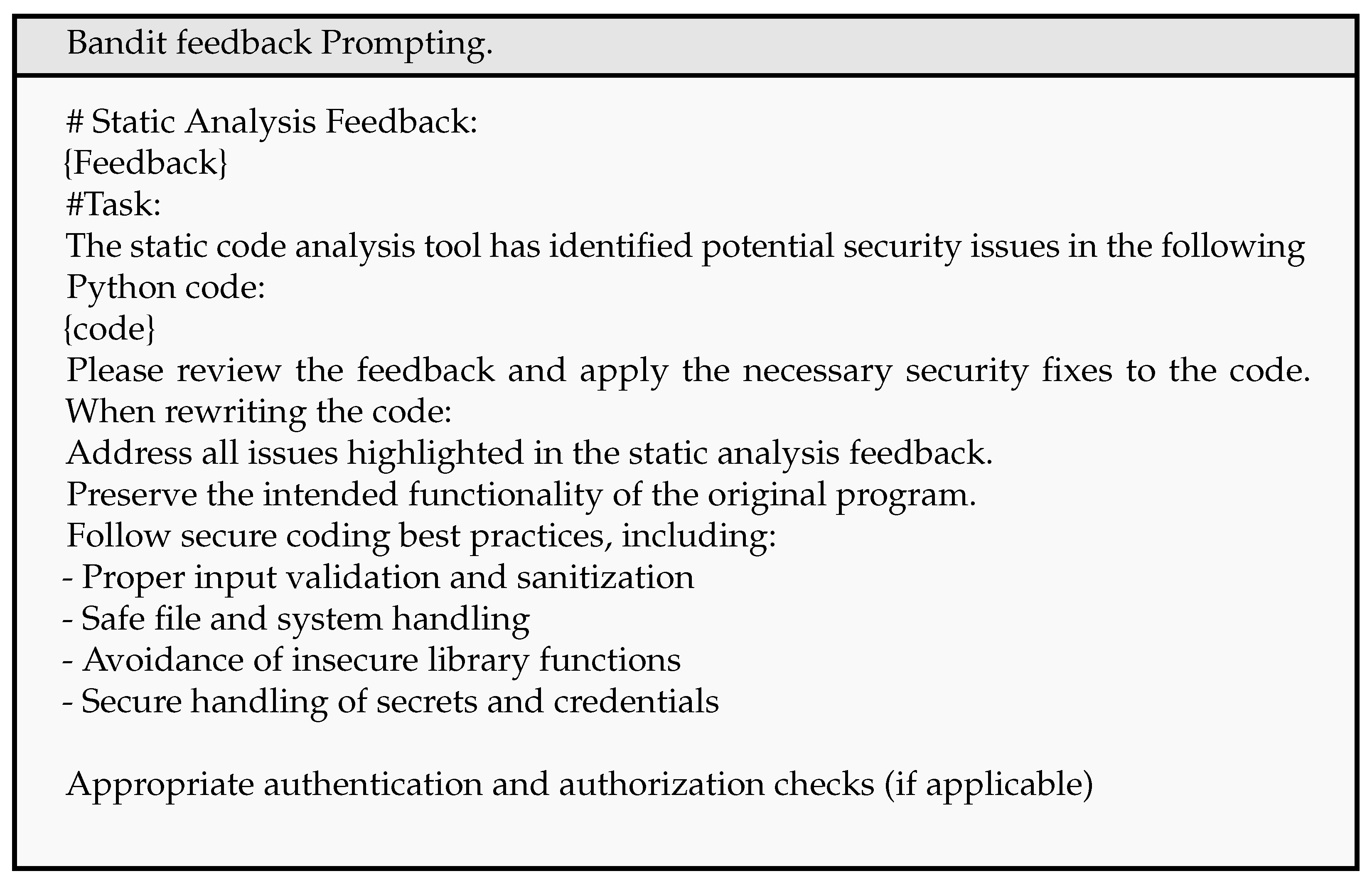 - Bandit: Bandit is an open-source static analysis tool developed by the OpenStack Security Project to identify security vulnerabilities in Python source code. Its core mechanism involves parsing the Abstract Syntax Tree (AST) of Python programs and systematically inspecting it to detect known security anti-patterns and vulnerable code constructs. Bandit’s rule set covers a broad range of common security issues in Python, including hardcoded credentials, weak cryptographic algorithms, and unsafe subprocess management. The tool automatically generates reports highlighting potential vulnerabilities, their severity, and their precise locations within the code. In this study, we leverage Bandit both as a vulnerability detection tool for providing external feedback to large language models (LLMs) during code refinement and as an evaluation metric for measuring the effectiveness of our approach.
