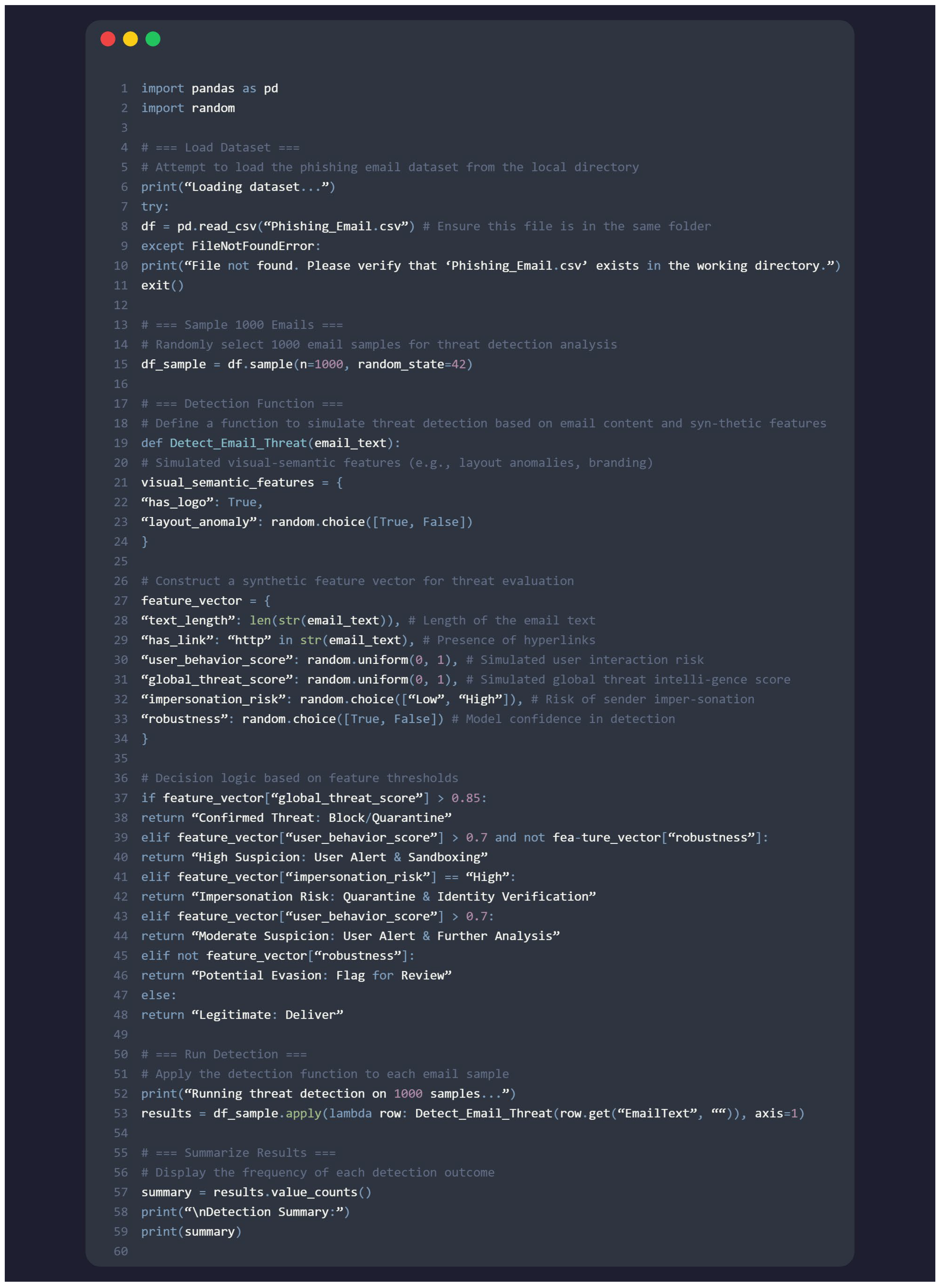 The script ingests a curated phishing email dataset and randomly selects 1000 entries for analysis. Each email is processed through a custom detection function that constructs a feature vector comprising attributes such as text length, hyperlink presence, impersonation risk, simulated user behaviour, and threat intelligence scores.