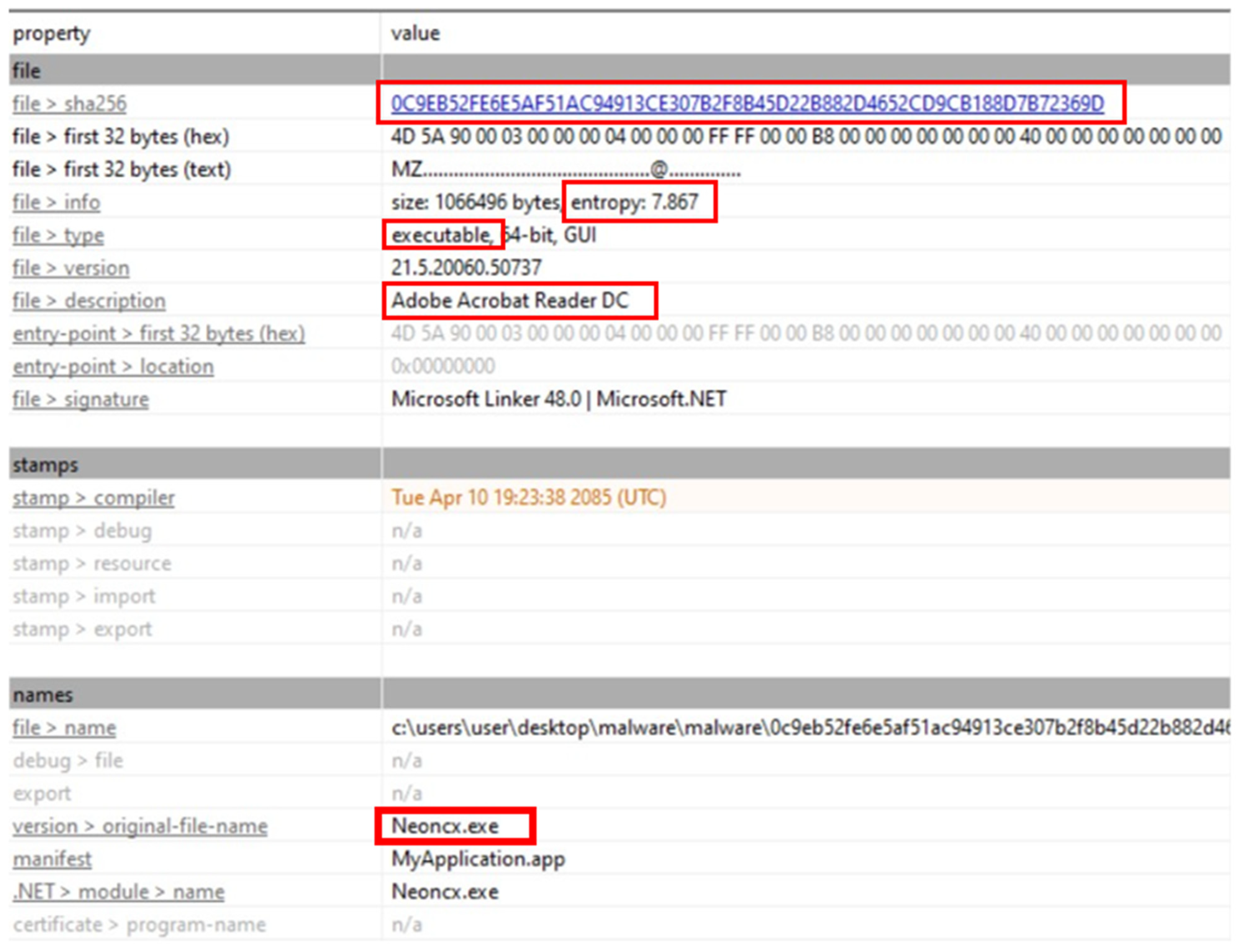Files containing malware exhibited high entropy and suspicious strings that indicate their true behavior. During dynamic analysis, these files were identified by observing modifications to the file system and registry, as well as changes to system configurations.