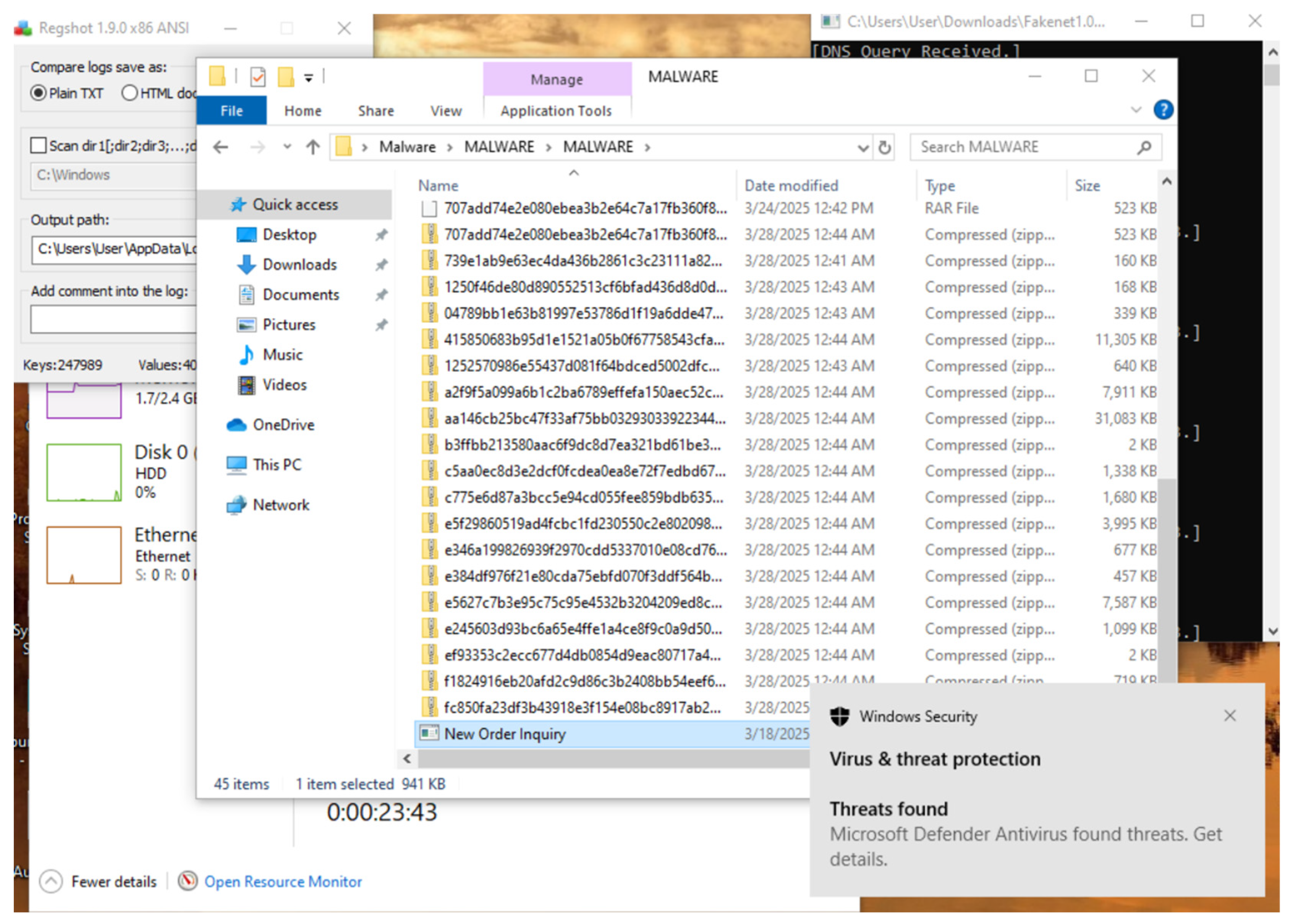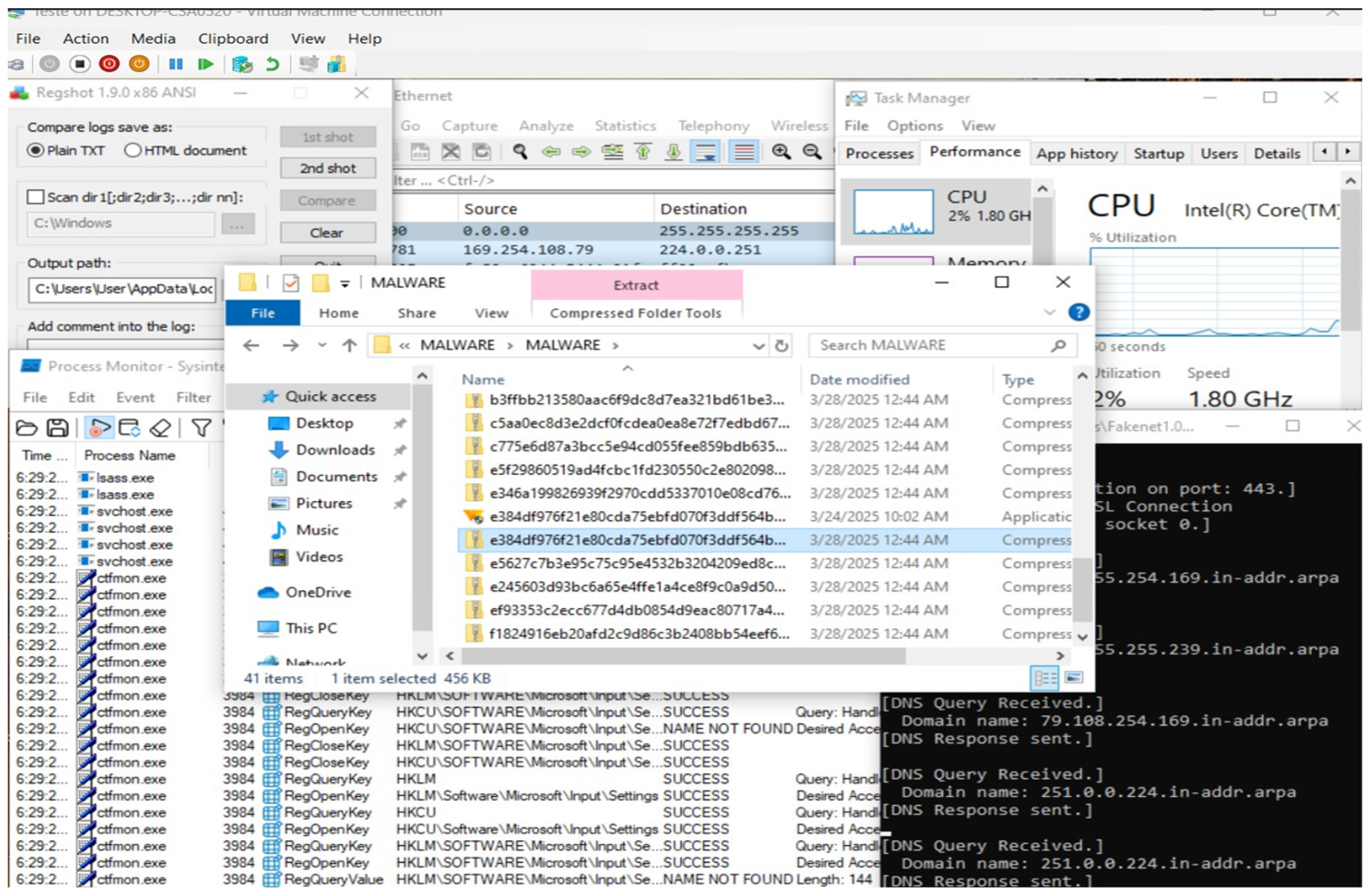 52], the emphasis is placed on the sandbox area and dynamic analysis of a malicious file. Thus, the advantages of using a sandbox environment are highlighted, through constant monitoring, at the level of an integrated platform, of aspects such as Process Monitoring, System Monitoring, Disk or Memory Usage, Network Monitoring, etc. Therefore, the focus of the paper is not on the actual analysis of malicious files, but on the presentation of the integrated platform, which includes the monitoring of various processes. In contrast to the present paper, this study directs attention to a more in-depth examination of various characteristics, including antivirus detection, file relocation, and the alterations made by malicious files at the level of system registry keys and values.