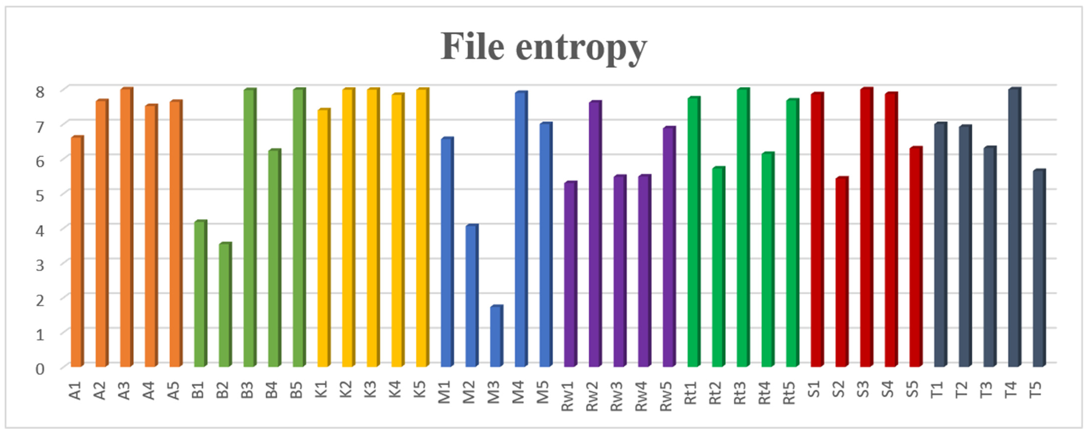 The files labeled A1, A3, A5, B2, B4, K1, K3, and K5 display relatively high entropy levels, suggesting that these files may be obfuscated or packed. This is typical for malware attempting to evade detection by security tools. The malicious files corresponding to these labels are categorized as adware, backdoor, and keylogger.