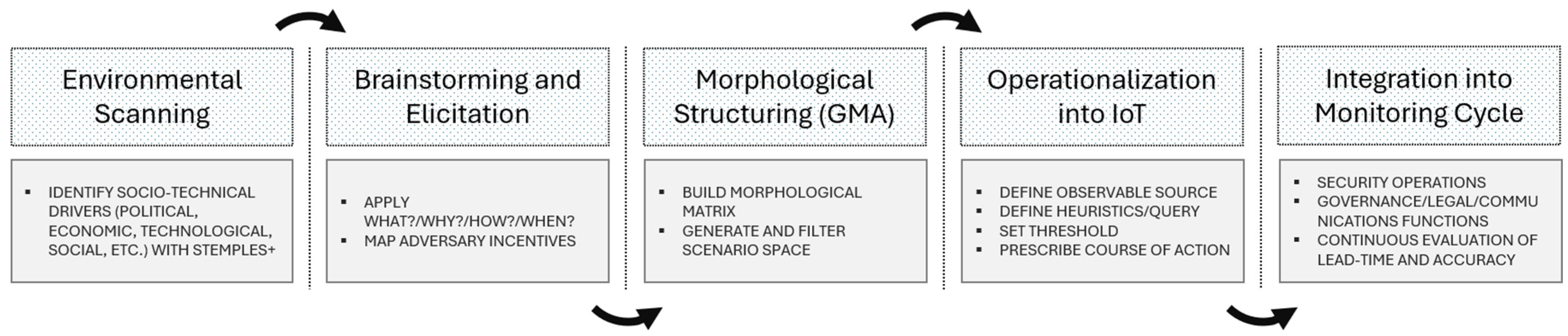 - Integration of methods: Early-warning systems identify signal sources (domain/CT dynamics, online conversations), yet they fail to integrate them into a reproducible, auditable, kill-chain-compatible organizing methodology that produces outputs (watchlists, thresholds, courses of action). GMA offers the requisite structuring capability but is underutilized in cybersecurity [4,5].