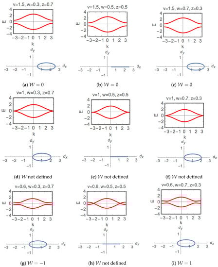 Dispersion relations, Equation (4) together with the corresponding vector , Equation (5), on plane as the wavenumber k is swept across the Brillouin zone, for nine different settings of hopping amplitudes: (a) , , ; (b) , , ; (c) , , ; (d) , , ; (e) , , ; (f) , , ; (g) , , ; (h) , , ; (i) , , .
