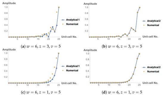 The edge-state wave function amplitudes for two different sets of parameters derived using method 1, discussed in last section, and method 2, comparing with the corresponding eigenvectors solved numerically from the Hamiltonian Equation (1), are plotted in Figure 5. For systems with , as shown in the first row, the edge state amplitudes exhibit non-monotonicity and local maxima, but for systems with , such as the example in the second row, the edge states decay monotonously from the end. There are some discrepancies between the analytical solutions calculated using method 1 and the numerical results, which may be due to the assumption behind the general expression, Equation (15). When writing the wave function in that form, it is already assumed that the eigenvectors for open chains can be written as linear combinations of the bulk eigenfunctions [30], but in fact the bulk eigenfunctions may not be a set of complete bases to construct the edge states of open chains.