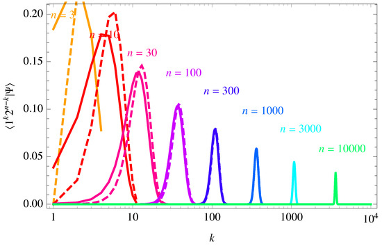 Figure 1 exemplifies how and converge to the same state for large n. We consider a two-state system with norm , such that the basis states of are , described by one integer k than runs from 0 to n. The eigenvalue is determined to be as in Equation (8) by imposing that the coefficients of the two states