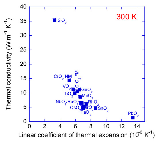 Calculated thermal conductivity as a function of the linear coefficient of thermal expansion for common rutile oxides. The data were obtained at 300 K. In the case of CrO2, nonmagnetic and ferromagnetic (FM) configurations were considered.