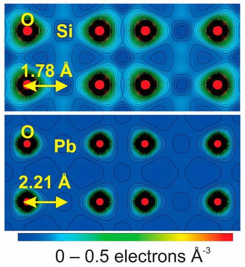 To rationalize the behavior of the boundaries (extremes) in Figure 1, the electronic structure of SiO2 (the smallest α value and the largest κ value) and PbO2 (vice versa) is explored in Figure 2. Both Si and Pb are depleted and the majority of charge is attracted by O. This is consistent with ionic bonding. There are important differences between these two rutile phases. While there is essentially no charge localized between Pb and O in PbO2, a considerable number of electrons are shared by Si and O in SiO2. Hence, SiO2 is characterized by ionic–covalent bonding and PbO2 possesses mainly the ionic contribution to the overall bonding. This is also mirrored in the bond length values for these two extremes, i.e., 1.78 vs. 2.21 Å, respectively. These electronic structure data are consistent with the literature [44,45]. Due to the bonding nature, SiO2 is expected to have stronger bonds than PbO2. Stronger bonds thus lead to low α and high κ, as observed in Figure 1 for SiO2. The opposite occurs for PbO2.