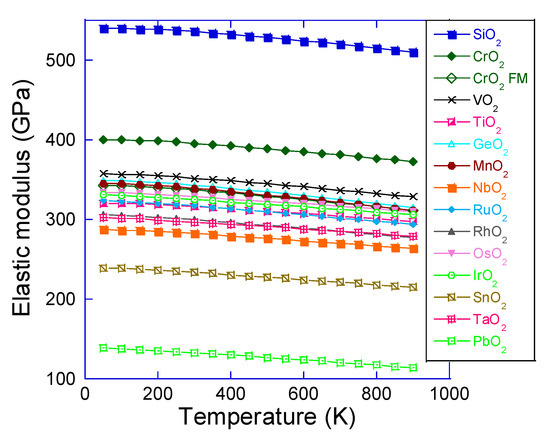 After discussing the behavior of κ and α in Equation (1), the elastic properties are considered. Figure 4 shows the dependence of Y on T for the common rutile oxides explored herein. The Y value slowly decreases with T, as expected, and the difference between the values for these binary oxides is constant. The stiffest rutile oxide is SiO2 and the softest one is PbO2, which is in agreement with the bonding analysis (see Figure 2) since SiO2 possesses the strongest bonds. The obtained elasticity values at 300 K are consistent with the available experimental data, deviating by 7.8% for TiO2 [65], 2.4% for CrO2 [2], 16.1% for MnO2 [66], 2.6% for NbO2 [67], 5.4% for OsO2 [68], 9.9% for IrO2 [69], 0.3% for PbO2 [70], and 7.9% for SiO2 [71]. This is acceptable based on the employed exchange-correlation functional, since deviations are commonly within 20% [72]. The calculated internal free parameter for the 4f Wyckoff site (O position) is in a narrow range from 0.345 to 0.348, being 11% deviated from the experiment value [73], but due to the obtained consistency with the elasticity data, this is acceptable. Moreover, the calculated values of Poisson’s ratio are in the range from 0.20 (SiO2) to 0.32 (PbO2).