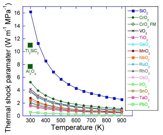 Calculated intrinsic thermal shock parameter as a function of temperature for common rutile oxides. No flexural strength values are included. The data points are connected to guide the eye. In the case of CrO2, nonmagnetic and ferromagnetic (FM) configurations were considered. The measured room-temperature data for Ti3SiC2 [74,75] and Al2O3 [14], known thermal shock resistant phases, are also added.