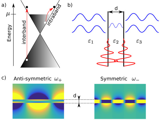 where is the in-plane wave vector, the angular frequency, and is the rescaled energy change upon absorption (+) and emission (−) of a photon. The prescription applies so that the function is analytic in all of the upper complex plane [27]. In Equation (1), the terms in arccosh correspond to the interband transitions taking place at , while the terms in characterise the intraband (Drude) response; see Figure 1a. In order to conserve the number of charge carriers at finite relaxation time , one must also make use of the Mermin prescription, given by [28]: