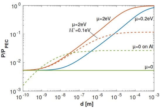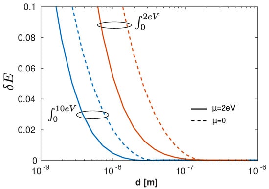 In order to illustrate this issue and test the validity of the Lifshitz approach in the case of graphene, we calculated the deviation arising from truncating the integral (Equation (7)). This truncation does not have a physical meaning; its purpose is just to have an idea of the importance of the high energy region on the Casimir effect. The results are shown in Figure 5, where we plotted with given by Equation (7), and is the same integral but truncated to eV (red lines) or 10 eV (blue lines).