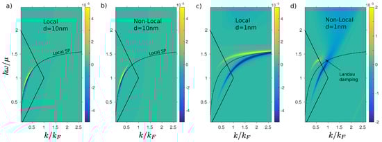 As the distance is decreased, such as in the step from Figure 3a,b to Figure 3c,d, the increased coupling leads to stronger modes which extend to larger wave vectors. At these shorter distances, non-local effects change the dispersion of the plasmons dramatically, mostly due to Landau damping, which takes place at and is clearly visible in Figure 3d. From Figure 3, we can deduce a cross-over in the coupling strength between the plasmons, where the Casimir forces will transition from being governed by Ohmic losses at low frequency and momentum to that of Landau damping when the plasmons are suitably energetic.