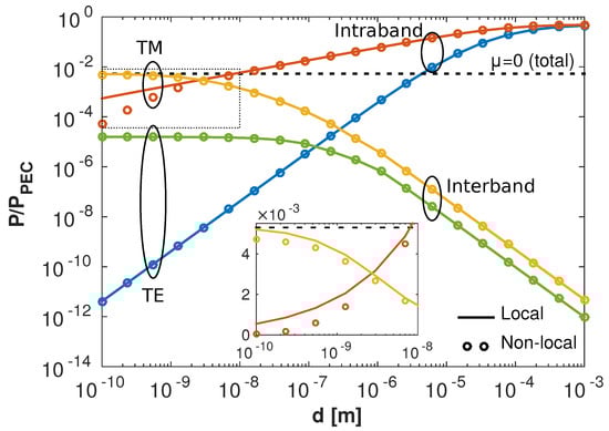 When including the effect of non-locality, displayed as open circles in Figure 4, we observe that mostly TM intraband processes, typically plasmons, are affected. This confirms the intuition derived from Figure 3. These excitations suffer from strong Landau damping at short distances because they correspond to a regime of high phase velocity (momentum), thereby reducing the force compared to the local picture. We can appreciate in the inset of Figure 4 that the non-locality makes a difference in the force spectrum, but it does not in the force.