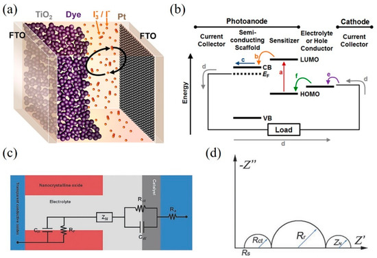 (a) A schematic representation of a dye-sensitized solar cell (DSSC). (b) Energy diagram and desired electron pathway for a DSSC. CB and VB refer to the conduction band and valence band, respectively. EF represents the Fermi level of the semiconductor. LUMO and HOMO levels are the lowest unoccupied and highest unoccupied molecular orbitals of the sensitizer. Reprinted with permission from [5]. Copyright (2014) American Chemical Society. (c) A schematic illustration of the impedance in a DSSC and equivalent circuit and (d) the corresponding Nyquist plot. Rr represents the charge-transfer resistance at the oxide/electrolyte interface. Cdl and Cµ represent the double-layer capacitance and nanocrystalline oxide capacitance, respectively [10,11]. Copyright 2020, WILEY-VCH.