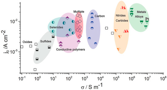 There are many different kinds of novel materials investigated as CE for DSSCs in recent years [12,13,14,15,16,17,18,19]. As mentioned above, the prerequisites to promising CEs are high exchange current density and high electrical conductivity. Figure 2 summarizes the exchange current density of various CEs based on their theoretical conductivity. It is demonstrated that the electrical conductivity of different CEs follow the order of metals and alloys > metal nitrides, metal carbides > carbon materials > multiple compounds > conductive polymers, selenides > sulfides > oxides. Among them, carbon-based materials are low-cost and promising CE materials to replacing Pt. Generally, carbon-based CEs possess sufficient conductivity and high resistance from electrolyte corrosion. However, the transparency of a DSSC is usually limited by the counter electrode, e.g., carbon-based CEs can be less translucent than platinized FTO. Though the CEs’ optical transparency is not mandatory for the proper function of DSSCs, it presents an added benefit for practical modules (i.e., light illumination from both sides of DSSC devices). Fortunately, graphene, one kind of carbon allotropes, exhibits remarkable carrier mobility (>2 × 105 cm2V−1s−1), high optical transparency, and specific surface area (2670 m2/g); those benefits make it be a promising CE material in DSSCs [20]. It has been shown that the specific surface area of carbon-based materials is positively correlated with the exchange current density (j0) or power conversion efficiency (PCE). To further increase the specific surface area and catalytic activity, the structural engineering of graphene to three-dimensional (3D) shape/morphology are efficient routes. It would expose many defects and/or functional groups such as hydroxyl groups (-OH), carbonyl groups (>C=O), and carboxyl groups (-COOH) when the structure of two-dimensional graphene transforms to three dimensions. Increasing the number of defects and/or functional groups leads to an improvement in electrocatalytic activity [21]. On the other hand, the insertion of heteroatoms into the basal plane of graphene is also an efficient way to enhance the intrinsic electrocatalytic activity of graphene, which is much lower than that of Pt [22,23,24].