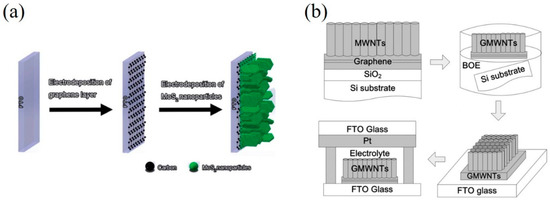 Many kinds of preparation methods including electrochemical deposition [25,26], chemical vapor deposition [27,28], doctor blade [29,30], and electrophoretic deposition [31,32] have been investigated for CE preparation in DSSCs. All of the preparation techniques were aimed to achieve high electrocatalytic activity and high conductivity of CE materials. Li et al. [26] reported an all electrochemical strategy to synthesize MoS2/graphene composite films as CEs in DSSCs (Figure 3a). The graphene oxide was electrodeposited and electro-reduced, and then MoS2 was subsequently electrodeposited on reduced graphene oxide layers. The MoS2/graphene composite film as CE exhibited higher electrocatalytic ability toward triiodide reduction reaction due to its 3D structure providing large surface area. Consequently, the DSSCs with optimized MoS2/graphene CEs exhibit a high PCE of 8.01%, which is comparable to 8.21% of DSSCs with Pt CEs. Choi et al. [28] demonstrated a CE using graphene-based multi-walled carbon nanotubes structure. Graphene layers were first drop-casted on a SiO2/Si substrate and multi-walled carbon nanotubes were synthesized on top of graphene layers with iron catalysts by CVD. The graphene-based multi-walled carbon nanotubes (GMWNTs) film was transferred onto the fluorine-doped tin oxide/glass substrate (Figure 3b). The DSSCs with graphene-based multi-walled carbon nanotubes as CE show an efficiency of 3.0% and high fill factor of 69%, suggesting graphene-based multi-walled carbon nanotubes were a promising candidate as the CE material in DSSCs.
